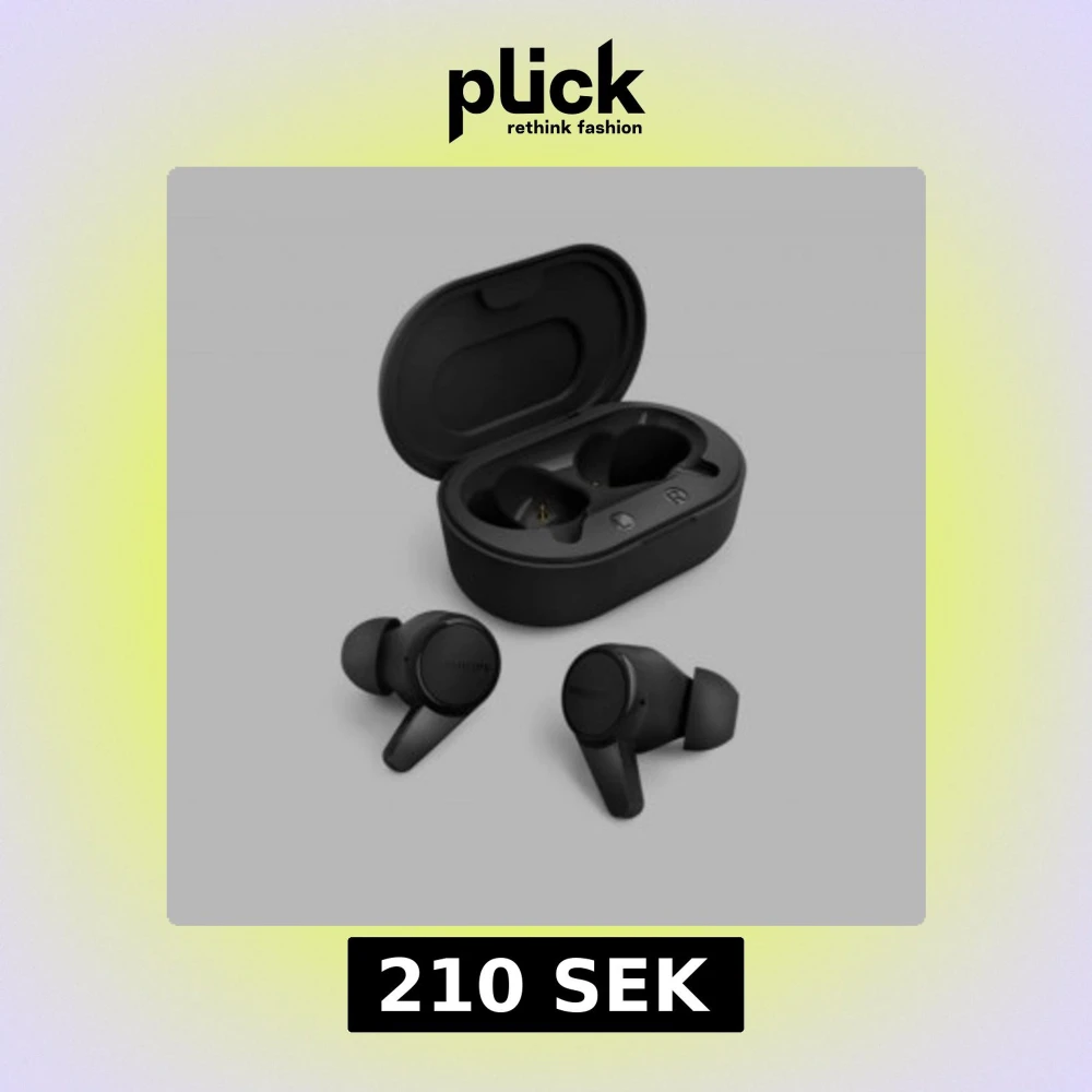 Snygga svarta Philips True Wireless hörlurar med laddningsetui. Kompakt design, perfekt för musik och samtal på språng. Hörlurarna och etuiet ser ut att vara i mycket gott skick utan synligt slitage eller repor.