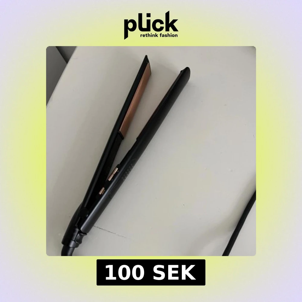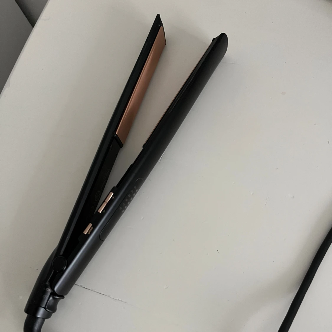 Elegant svart plattång med keramiska plattor i kopparfärg. Produkten ser ut att vara i gott skick utan synligt slitage eller defekter. Perfekt för att skapa släta och glansiga frisyrer. Enkel att använda med smidig sladd och värmereglering.