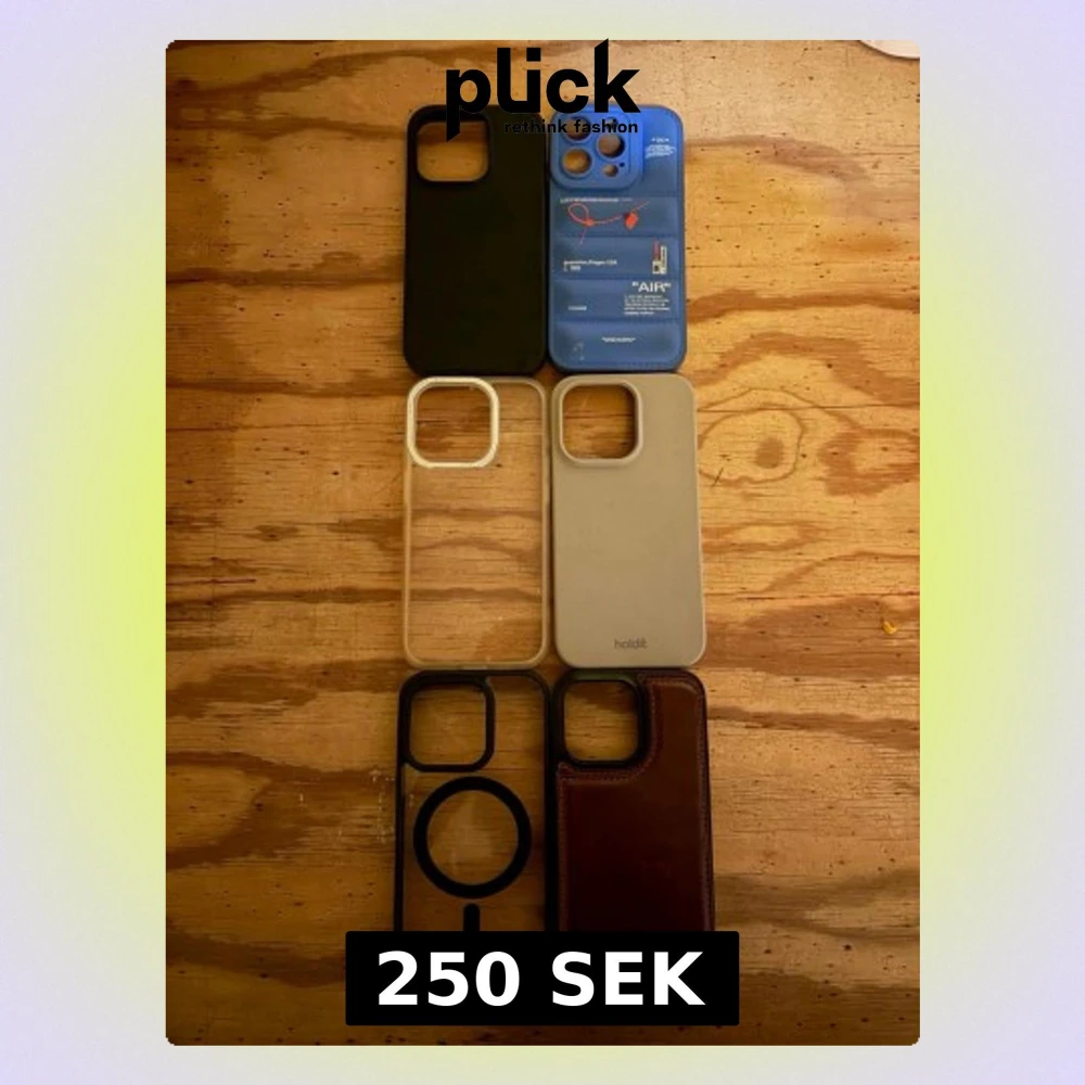 Säljer flera olika iPhone-skal: svart silikon, blått skal med Off-White design, transparent plast, beige silikon från Holdit, svart MagSafe-kompatibelt och ett brunt läderskal. Paketpris 250
