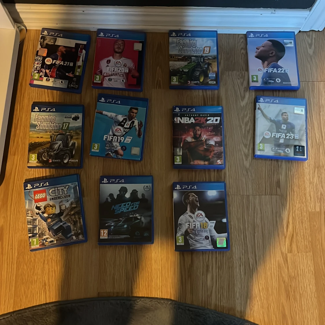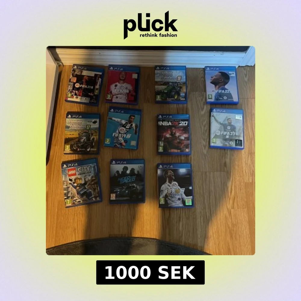 Samling med 11 PS4-spel, inklusive FIFA 18-23, Farming Simulator 17 & 19, NBA 2K20, LEGO City Undercover och Need for Speed. Alla fodral ser hela ut och spelen är i gott skick, perfekt för sport- och simulatorentusiasten.