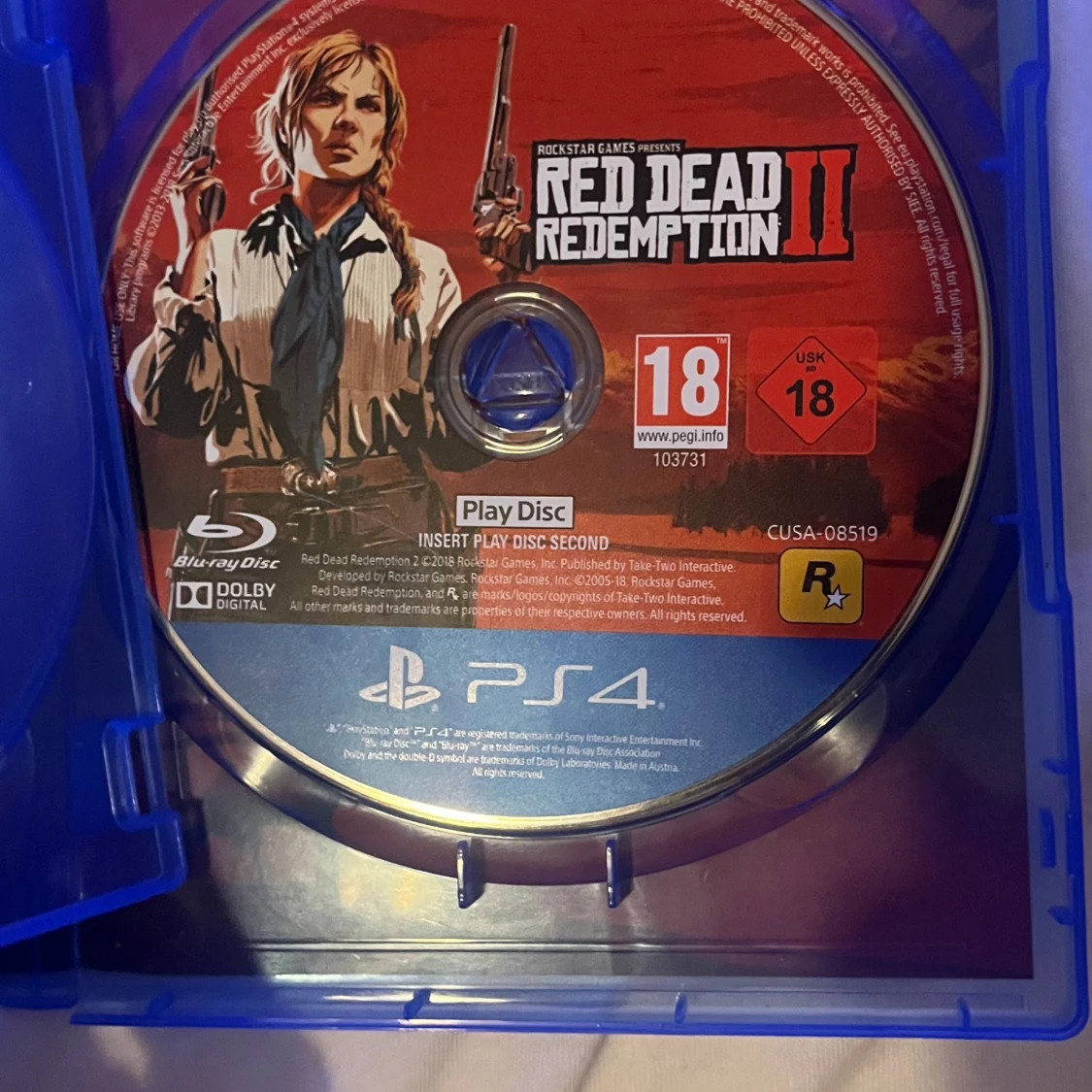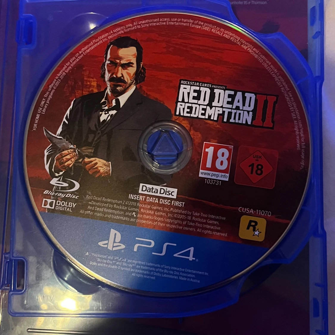 Red Dead Redemption II till PlayStation 4, komplett med fodral och båda skivor (data och play disc). Omslag och skivor i gott skick, inga synliga repor eller skador. Ett av de mest hyllade äventyrsspelen med öppen värld och fantastisk grafik.