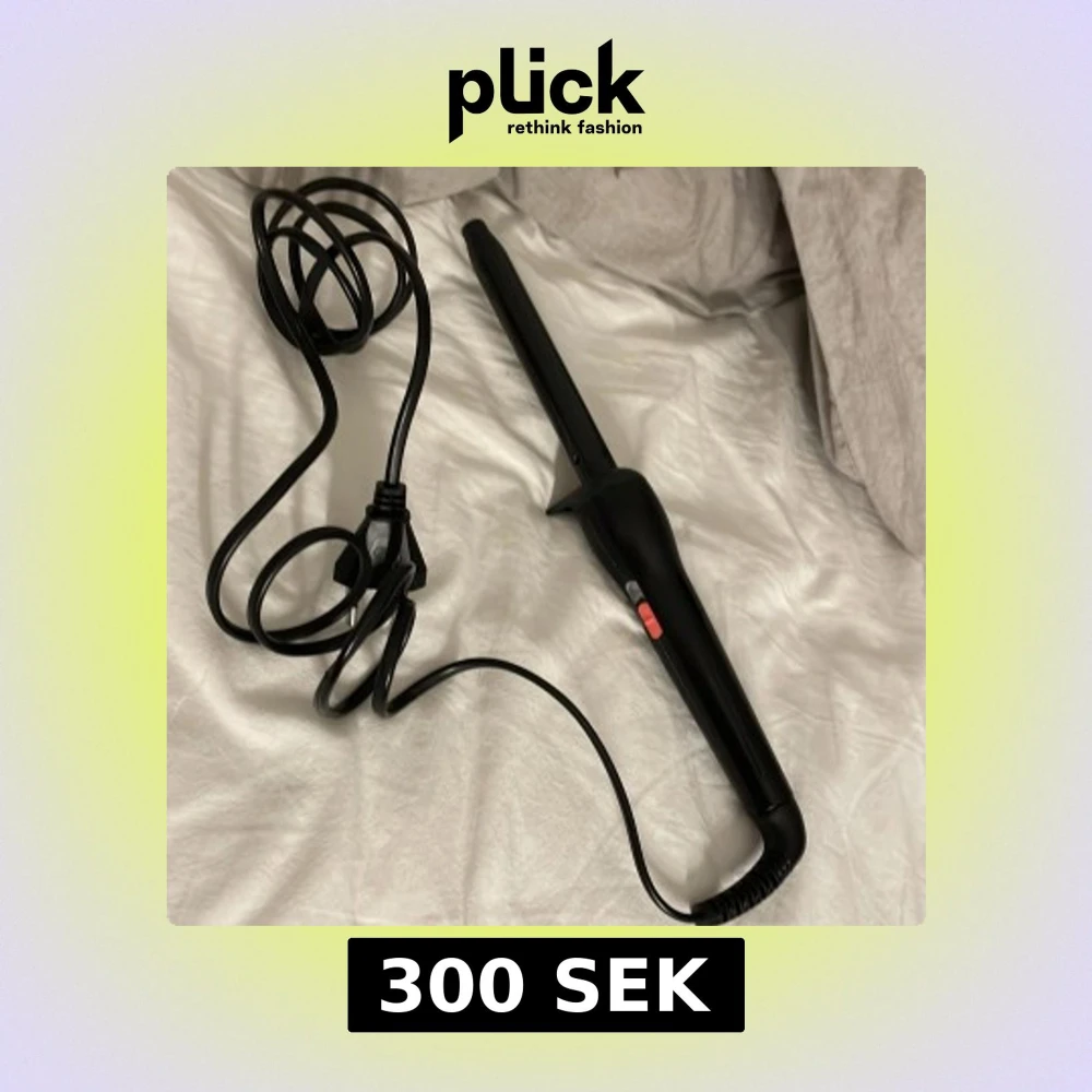 En svart locktång med konisk stav och lång sladd. Utrustad med en röd strömbrytare. Produkten ser ut att vara i gott skick utan synliga skador eller slitage. Perfekt för att skapa vackra lockar snabbt och enkelt.