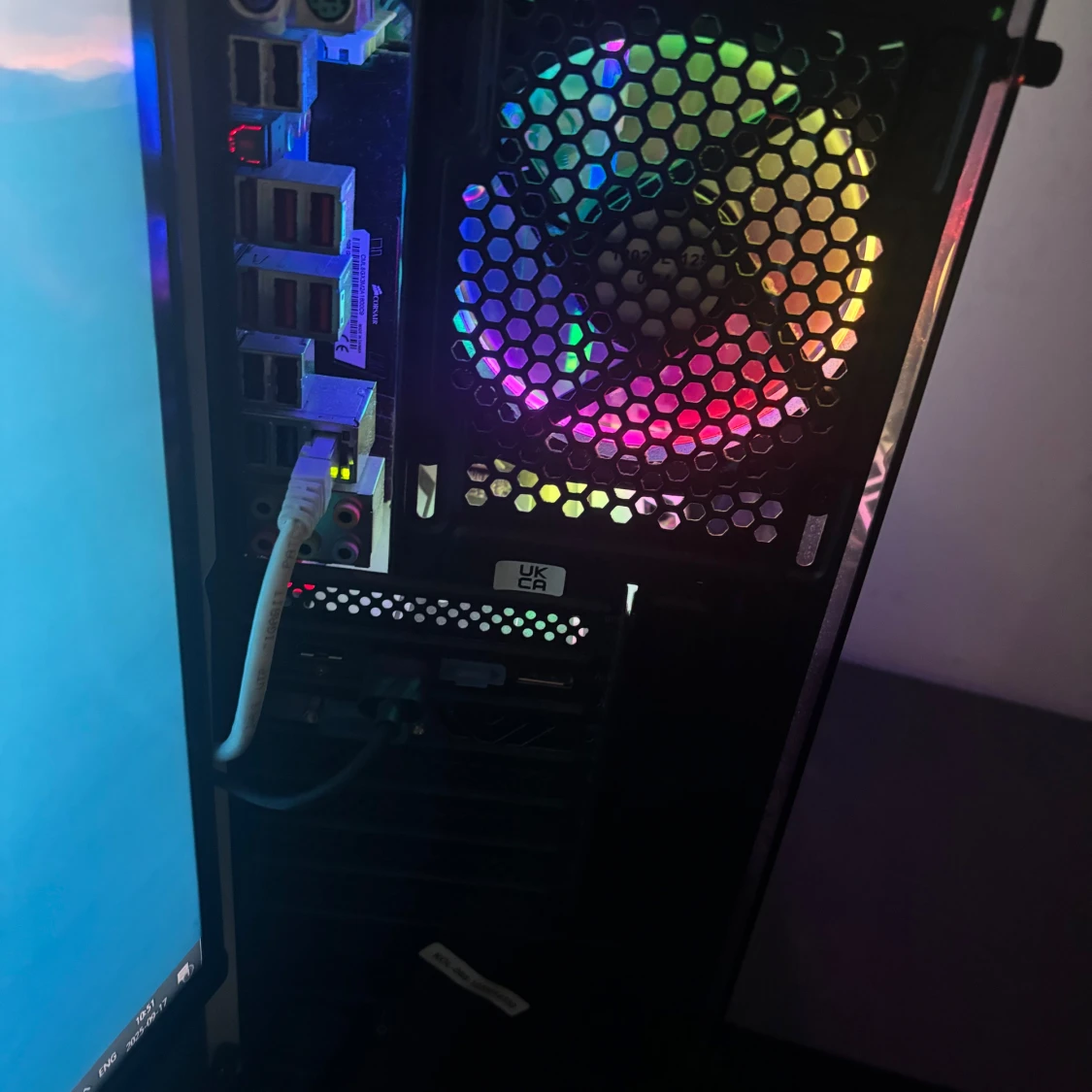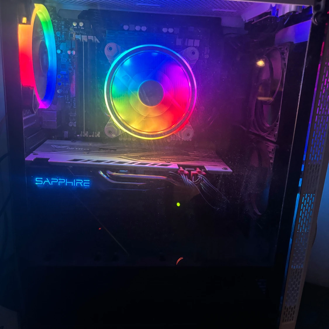 Snygg stationär gamingdator med AMD grafikkort och RGB-belysning. Utrustad med flera RGB-fläktar, modern vit chassi med unikt frontpaneldesign och gott om USB-portar. Inga synliga skador, lätt damm på insidan. Perfekt för gaming och kreativa uppgifter. Datorn har jag haft i ungefär ett år men inte använd så mycket eftersom jag slutade spela. Skrolla till sista bilden för att se datorns egenskaper. Skriv för mer frågor, pris kan diskuteras också.