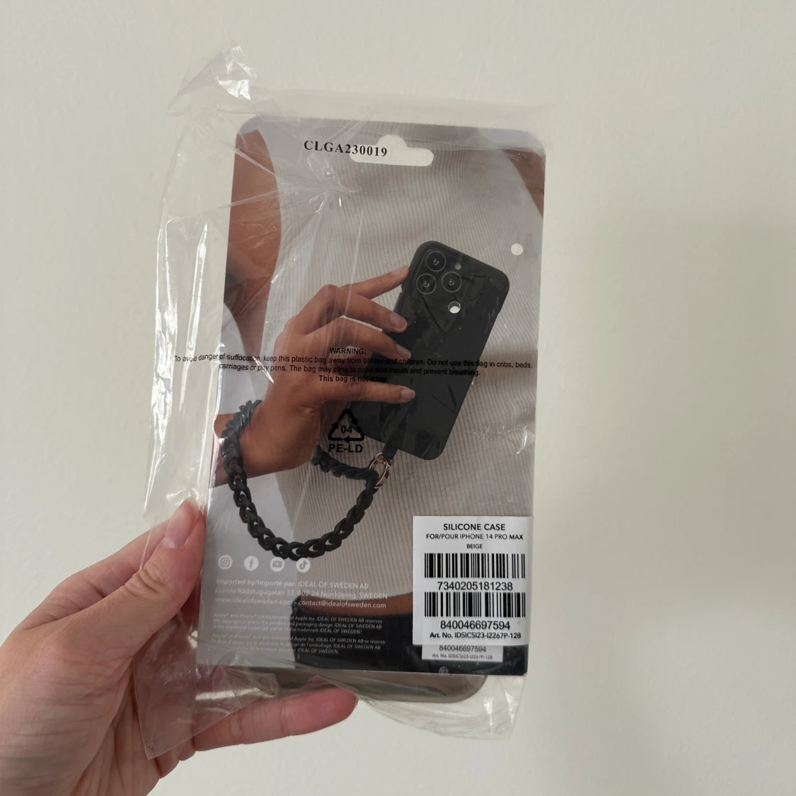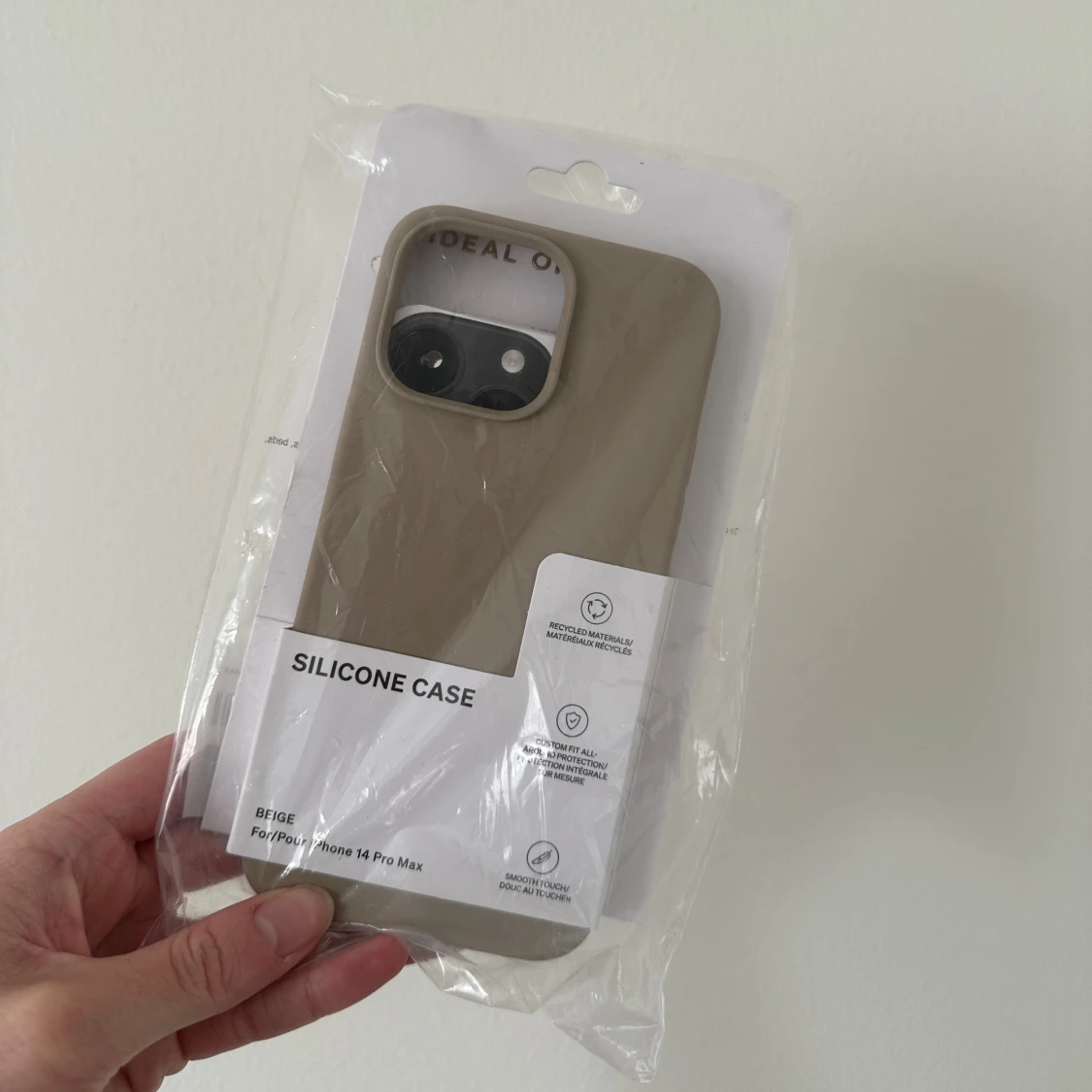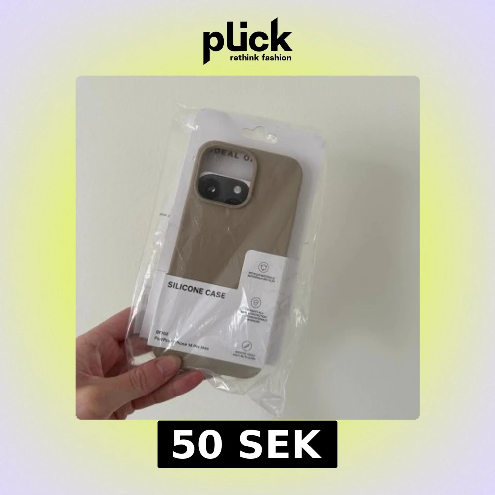 Beige silikonfodral för iPhone 14 Pro Max, nytt i obruten förpackning. Tillverkat av återvunnet material, ger ett mjukt grepp och skyddar mot repor och stötar. Passar perfekt och har en stilren design. Inga synliga defekter eller slitage.