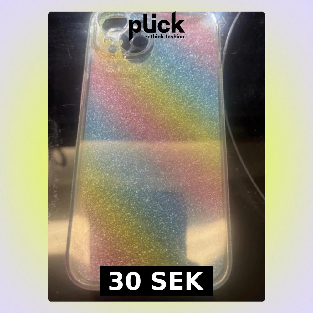 iPhone 15 skal regnbågen färg med glitter. Insidan går att ta bort men är oxå glittrig på sidorna.
