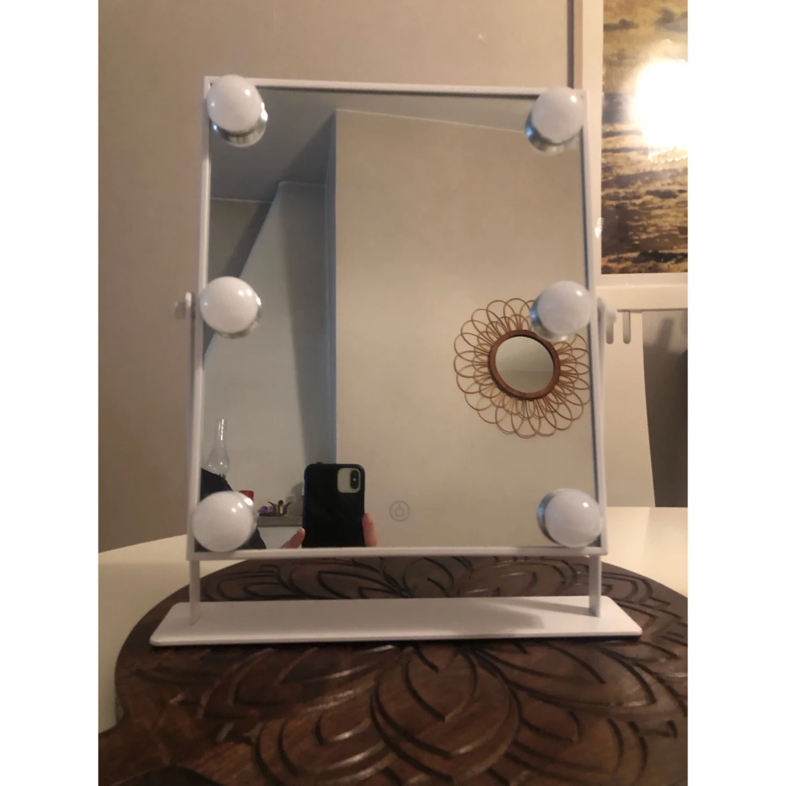 Elegant sminkspegel med 8 starka LED-lampor för optimal belysning. Perfekt för makeup och styling. Vit ram och stabil fot. Spegeln är i mycket fint skick utan synliga repor eller skador. Touch-knapp för enkel av/på-funktion. Finns olika lägen för hur stark belysningen ska vara, du kan enkelt anpassa styrkan till ditt önskemål. Snygg och praktisk detalj till sminkbordet. 34x30 cm. (Med foten).