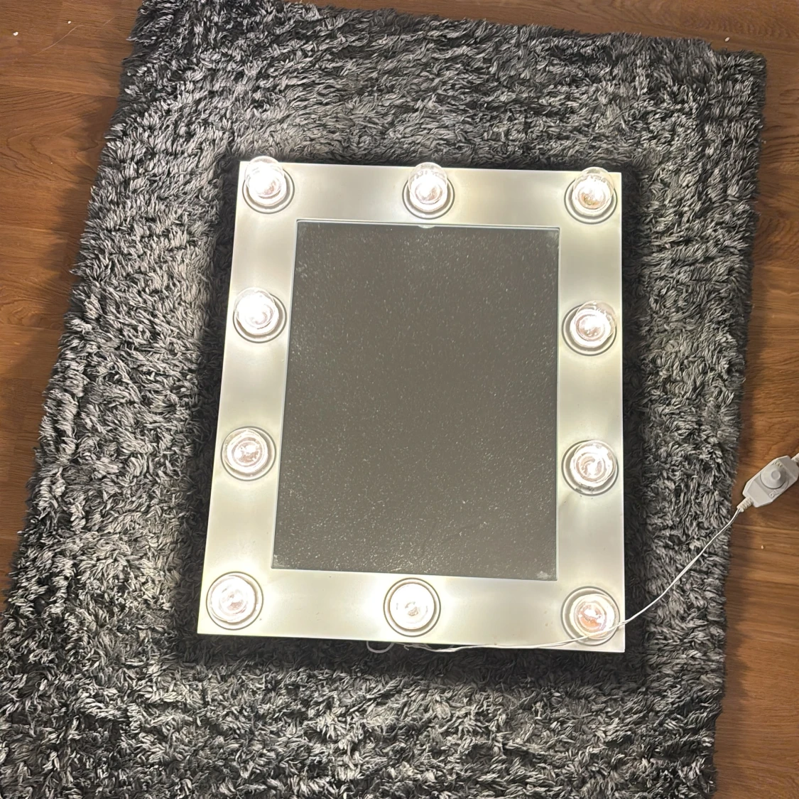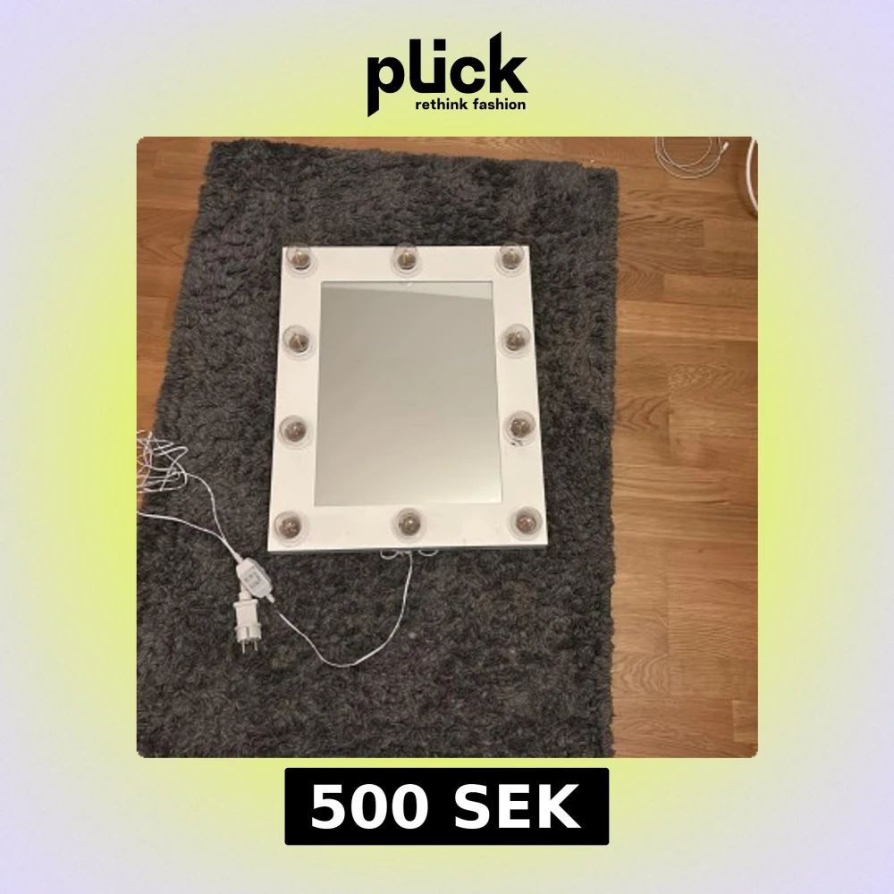Elegant sminkspegel med 10 LED-lampor runt ramen för optimal belysning. Spegeln är vit och ansluts med strömkabel, perfekt för makeup eller styling. Lamporna fungerar och ger starkt ljus. Mindre slitage syns på ramen, men i gott skick.