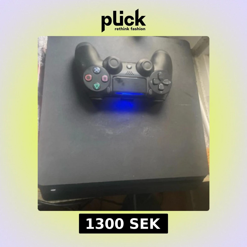 Sony PlayStation 4 med original DualShock 4-kontroll. Konsolen visar tecken på normalt slitage med några ytliga repor, men är i fungerande skick. Perfekt för gaming och multimedia. Kontrollen lyser och verkar vara ansluten.