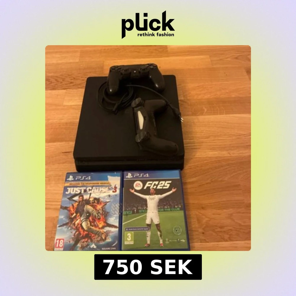PlayStation 4 i gott skick med två handkontroller och hdmi kabel Inkluderar spelen Just Cause 3 och EA Sports FC 25. Priset kan diskuteras.