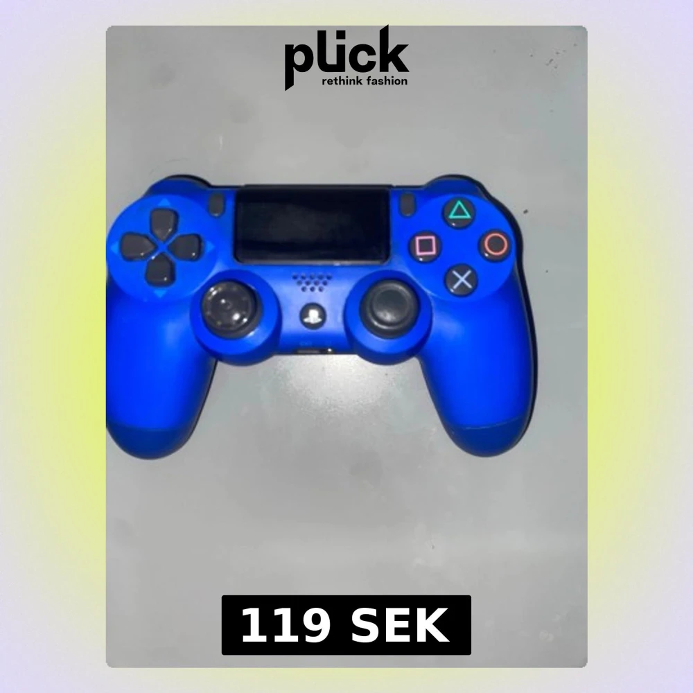 Blå PlayStation DualShock 4 trådlös handkontroll i gott skick. Alla knappar och styrspakar syns tydligt, och inga större repor eller skador är synliga. Perfekt för PlayStation 4-spelare som vill ha en extra eller ersättningskontroll. Lite sönder vänster spak.