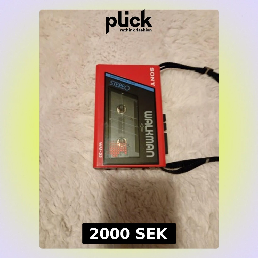 Retro Sony Walkman WM-22 i rött utförande. Stereo kassettspelare med tydliga knappar och medföljande rem. Produkten ser ut att vara i gott skick med minimalt synligt slitage, perfekt för samlare eller nostalgiska musikälskare.