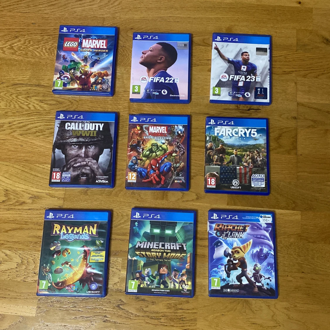 Paket med 9 PS4-spel: LEGO Marvel Super Heroes, FIFA 22, FIFA 23, Call of Duty, Marvel Super Heroes 2, Far Cry 5, Rayman Legends, Minecraft Story Mode och Ratchet & Clank. Skivorna och fodralen ser ut att vara i gott skick, perfekta för både barn och vuxna.