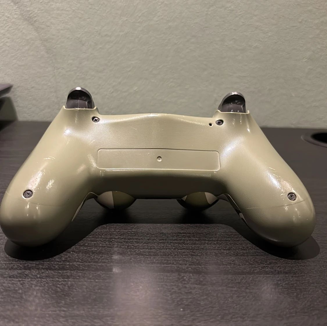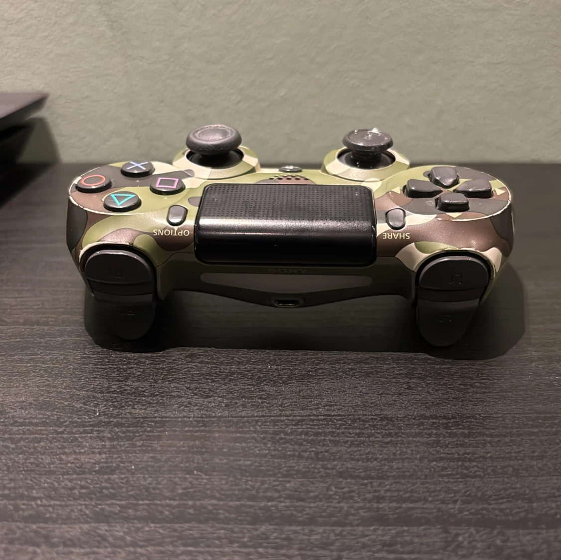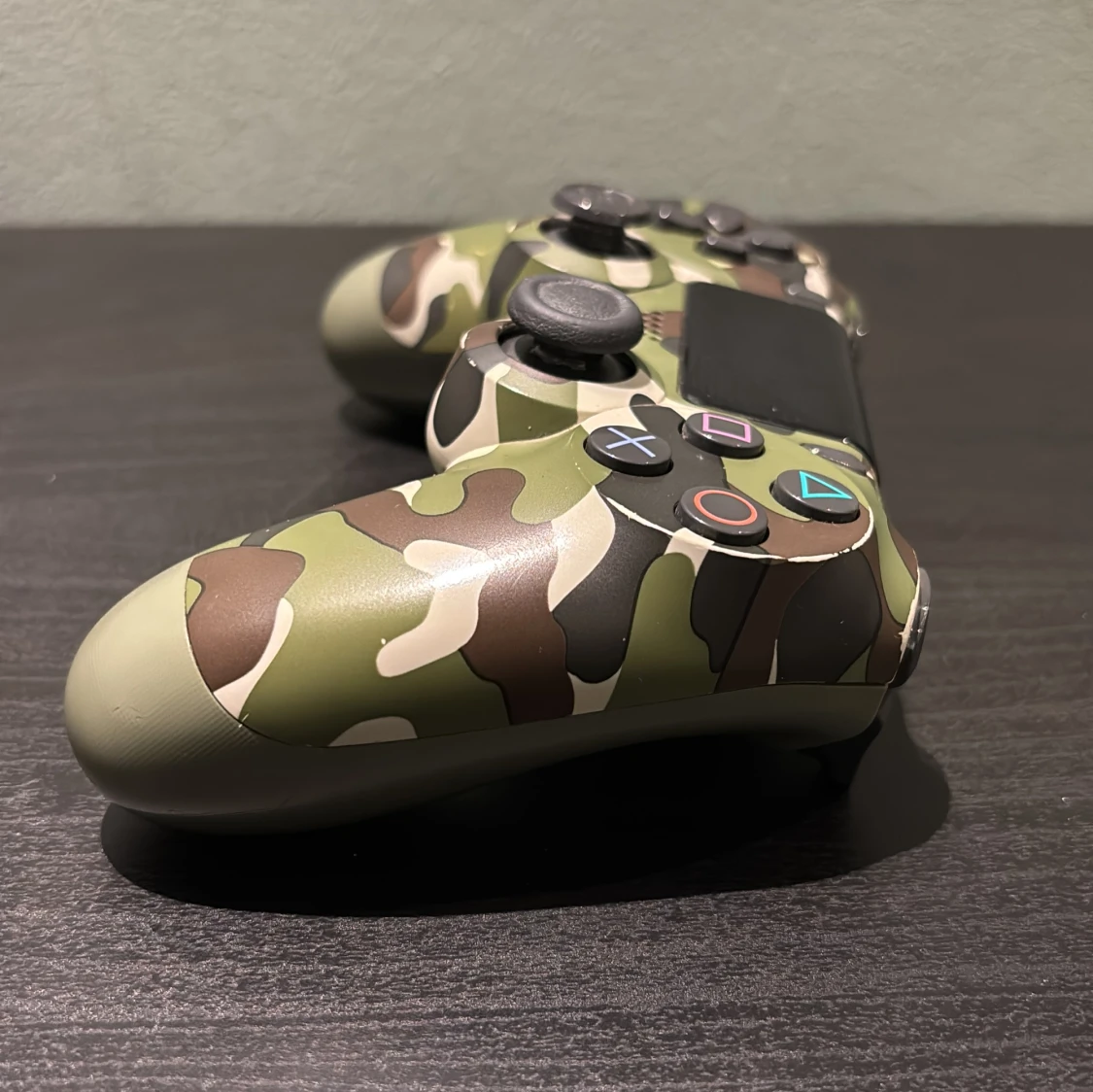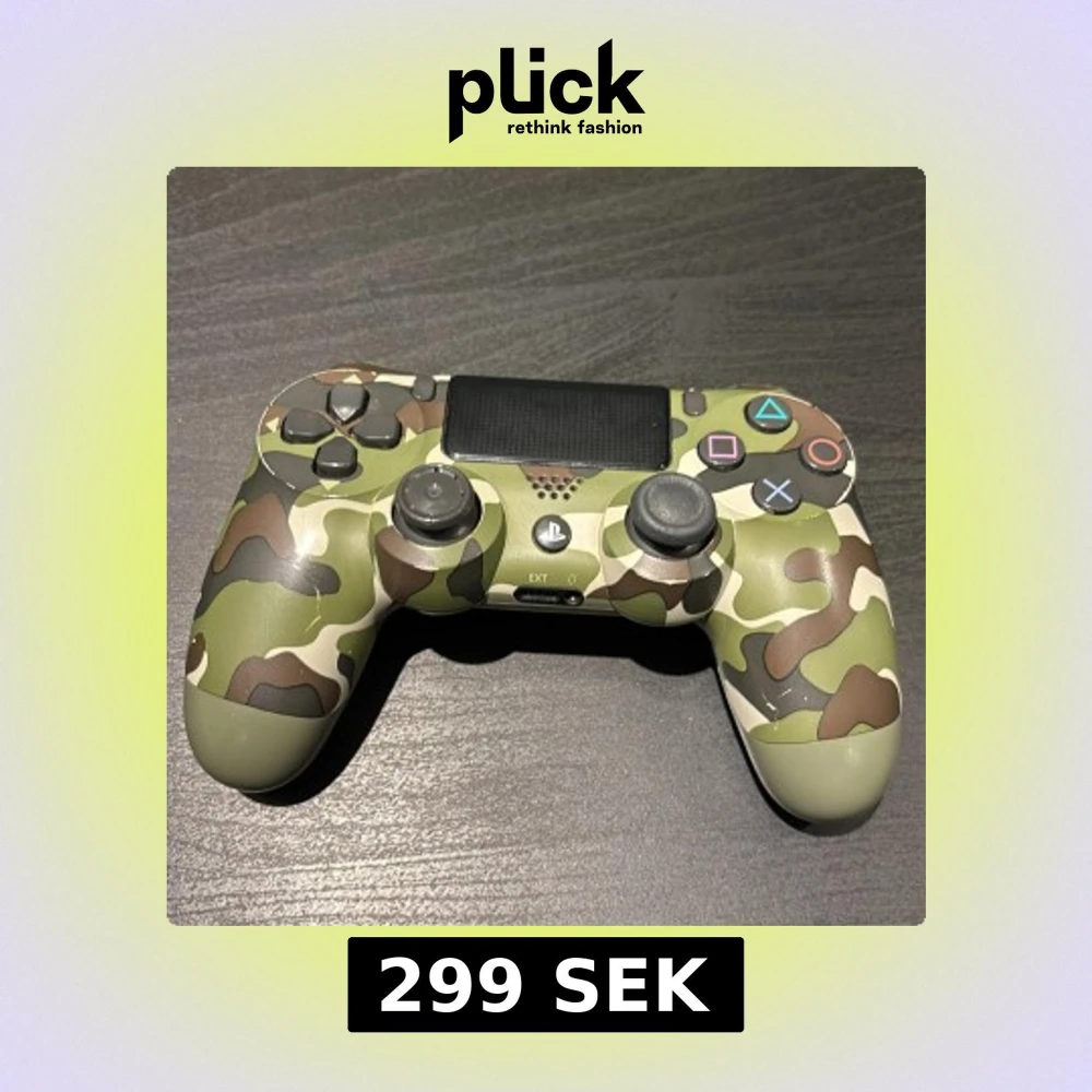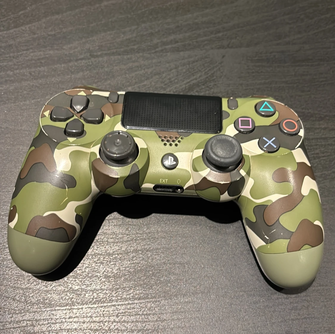Snygg Sony DualShock 4 trådlös handkontroll i camouflage-design för PlayStation 4. Kontrollen är i gott skick med mindre slitage på styrspakarna, alla knappar och funktioner fungerar. Perfekt för dig som vill ha en unik och pålitlig spelupplevelse.