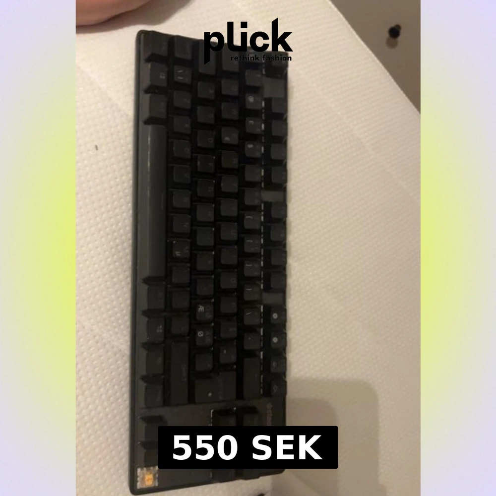 Kompakt SteelSeries mekaniskt tangentbord i svart. Tangenterna ser ut att vara i gott skick, men en tangent saknas i nedre vänstra hörnet. Perfekt för gaming eller arbete, med responsiva mekaniska switchar och robust design.