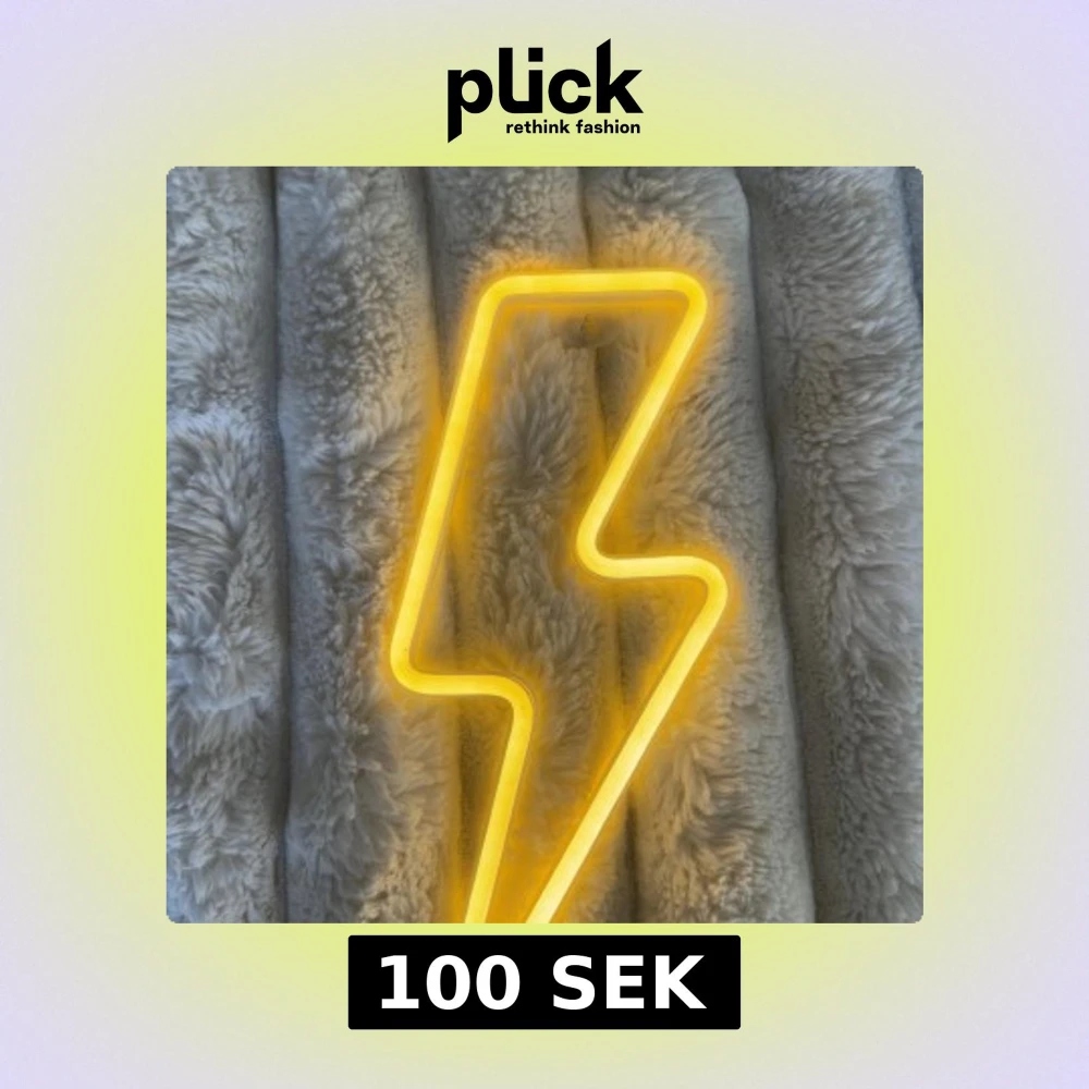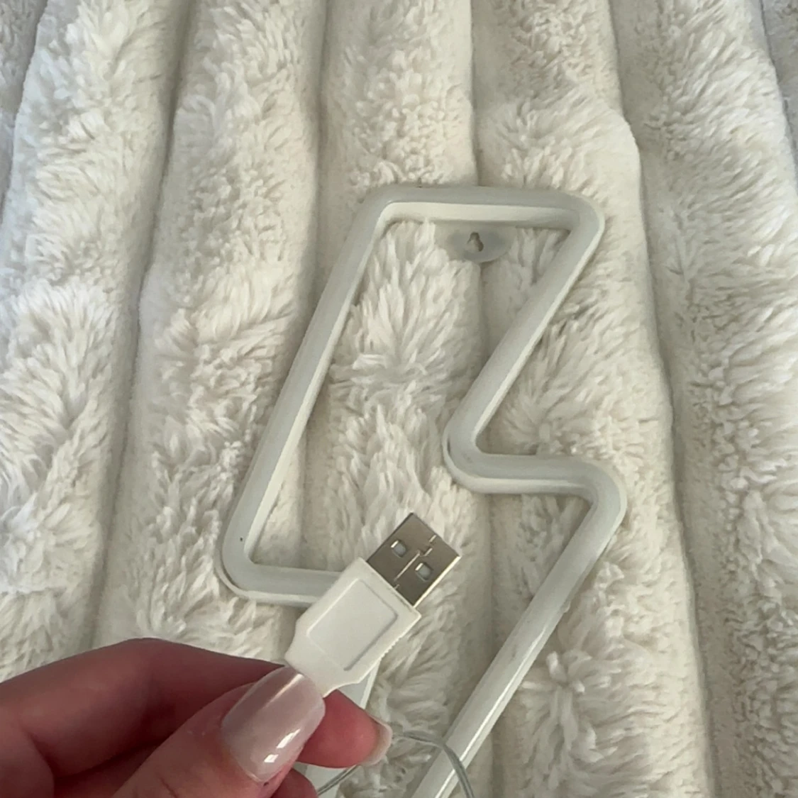 Dekorativ neonlampa i form av en blixt, drivs via USB. Ger ett starkt gult sken och passar perfekt som väggdekoration. Lampan är i gott skick utan synliga defekter eller slitage. Enkel att använda och koppla in.