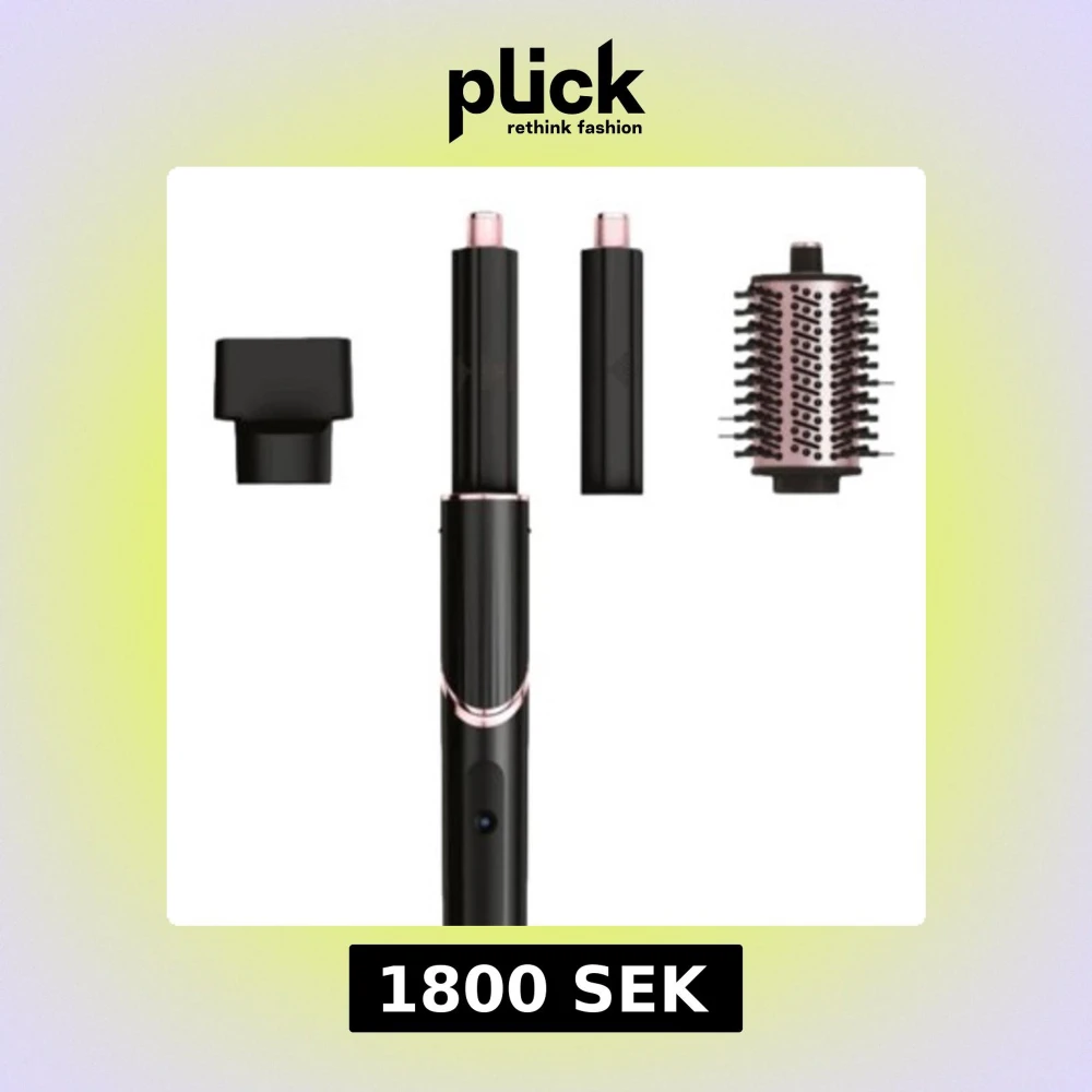 Elegant varmluftsborste i svart och roséguld med flera utbytbara tillbehör för styling, inklusive rundborste, locktillbehör och fönmunstycke. Perfekt för att skapa volym, lockar och släta frisyrer. Produkten ser ut att vara i mycket gott skick utan synligt slitage.
