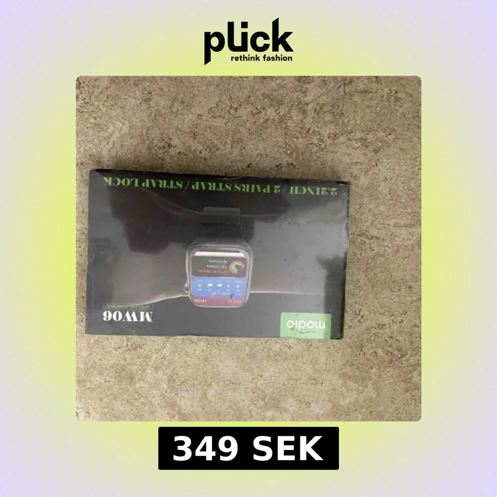 Säljer en svart smartklocka Modio MW06 med fyrkantig display och flera funktioner som aktivitetsmätning och trådlös laddning. Klockan har en modern look och passar dig som gillar teknik och vill ha koll på din vardag direkt på handleden.