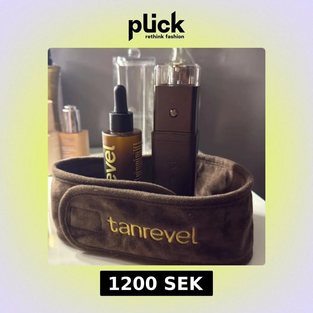 Tanrevel Starter Kit med spraytan-enhet, serumflaska och mjukt pannband. Allt ser välvårdat ut utan synligt slitage. Perfekt för smidig och jämn brun-utan-sol applicering hemma. Enheten är portabel och enkel att använda. Dark Cool 50% kvar. Lock möjligtvis borttappat. Org pris 1498kr