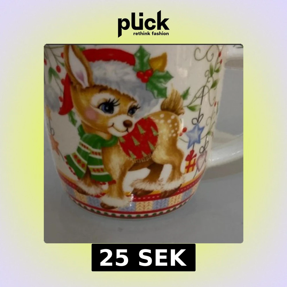 Bilderna visar en julmugg med ett sött renmotiv, perfekt för varma drycker under vintern. Muggen har färgglada detaljer med en ren i tomteluva och halsduk, samt juldekorationer. Inga synliga skador eller slitage. Passar utmärkt som present eller till julfikat.