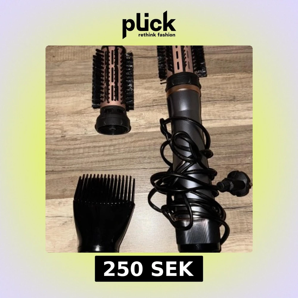 Multifunktionell varmluftsborste med två rundborstar och en kamtillbehör. Perfekt för att styla och torka håret samtidigt. Produkten ser ut att vara i gott skick med minimalt slitage. Sladd och kontakt är intakta.