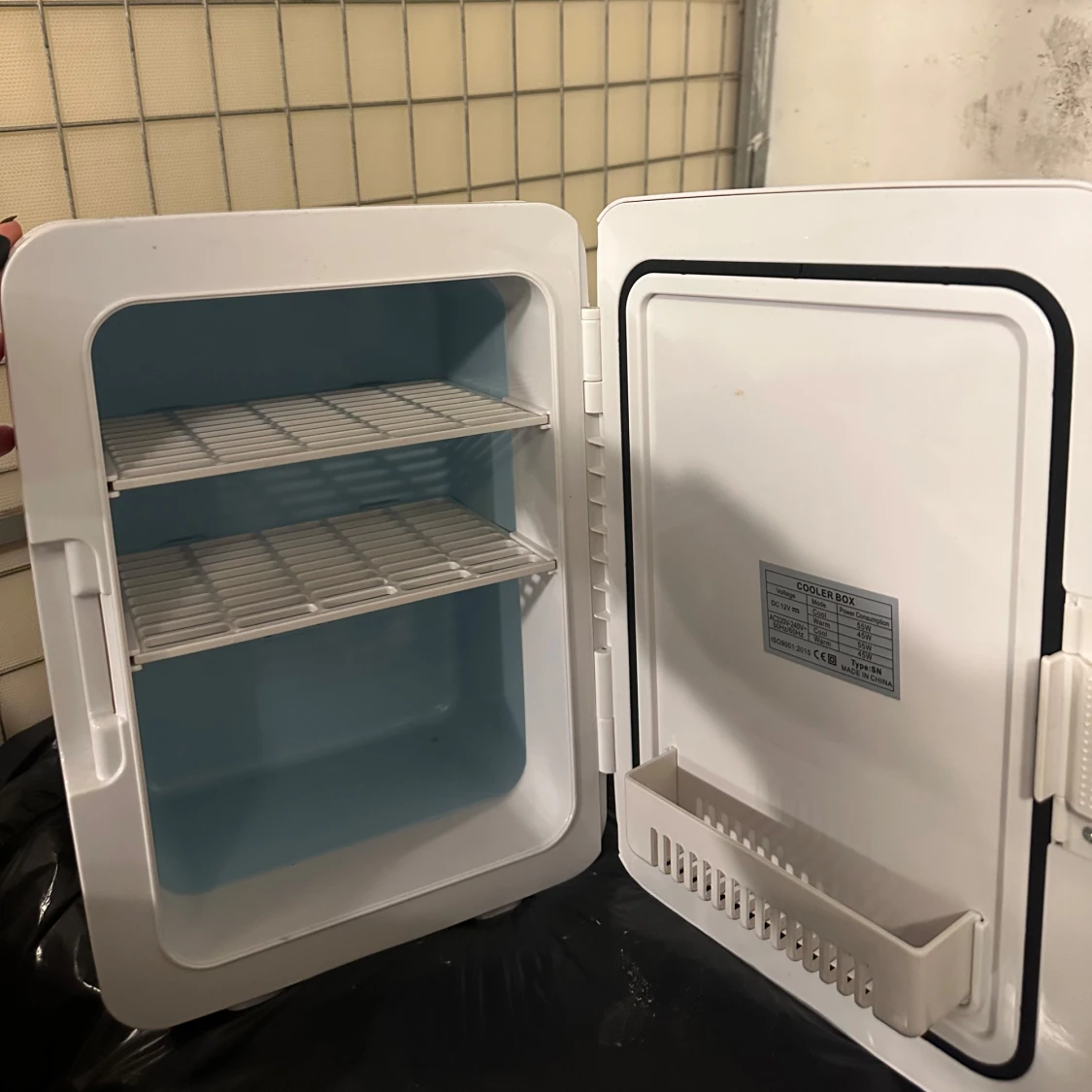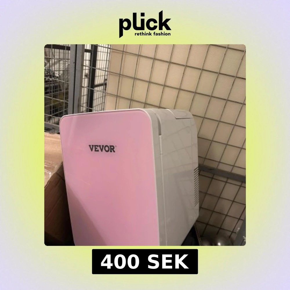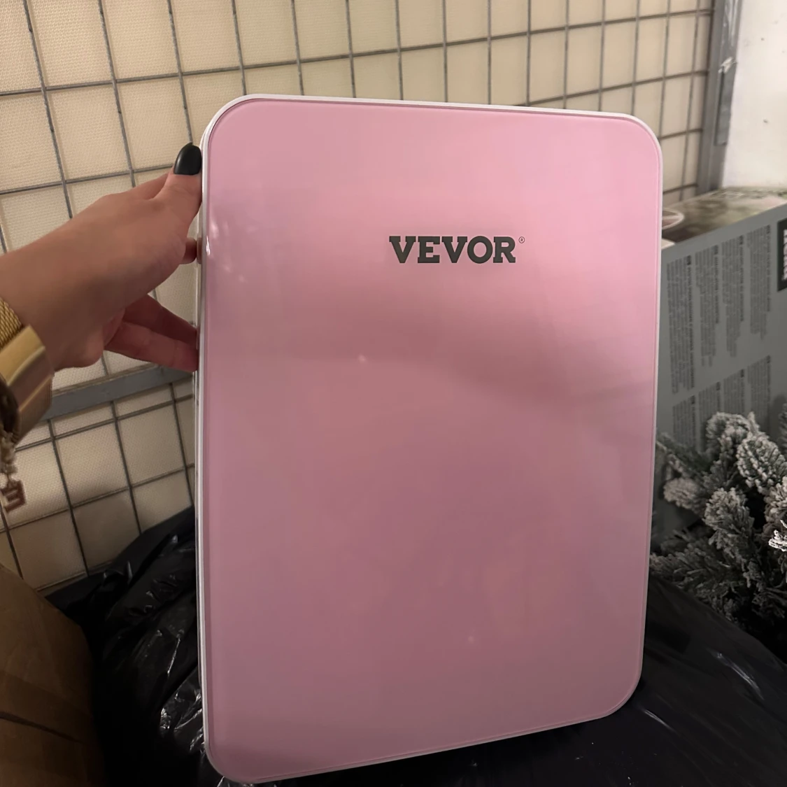 Snyggt och kompakt Vevor mini kylskåp i rosa. Perfekt för kontor, sovrum eller resor. Två hyllor och dörrfack ger bra förvaring. Den både kyler och värmer