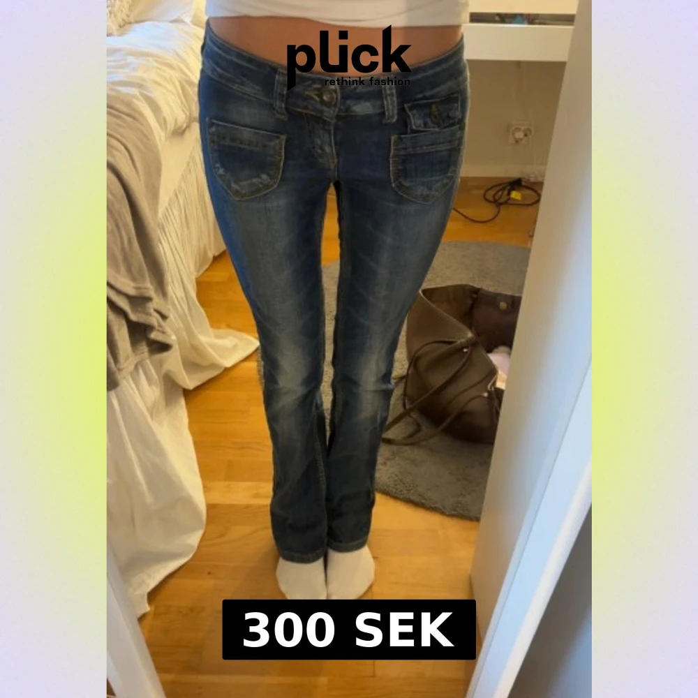 Snygga blå jeans med bootcut och låg midja, klassisk femficksdesign och slitna detaljer. Jeansen har markerade sömmar och är tillverkade i jeansmaterial med en cool tvättad look. Perfekt för dig som gillar retrovibbar och vill ha en avslappnad stil. Stl 27/32, använda men i fint skick
