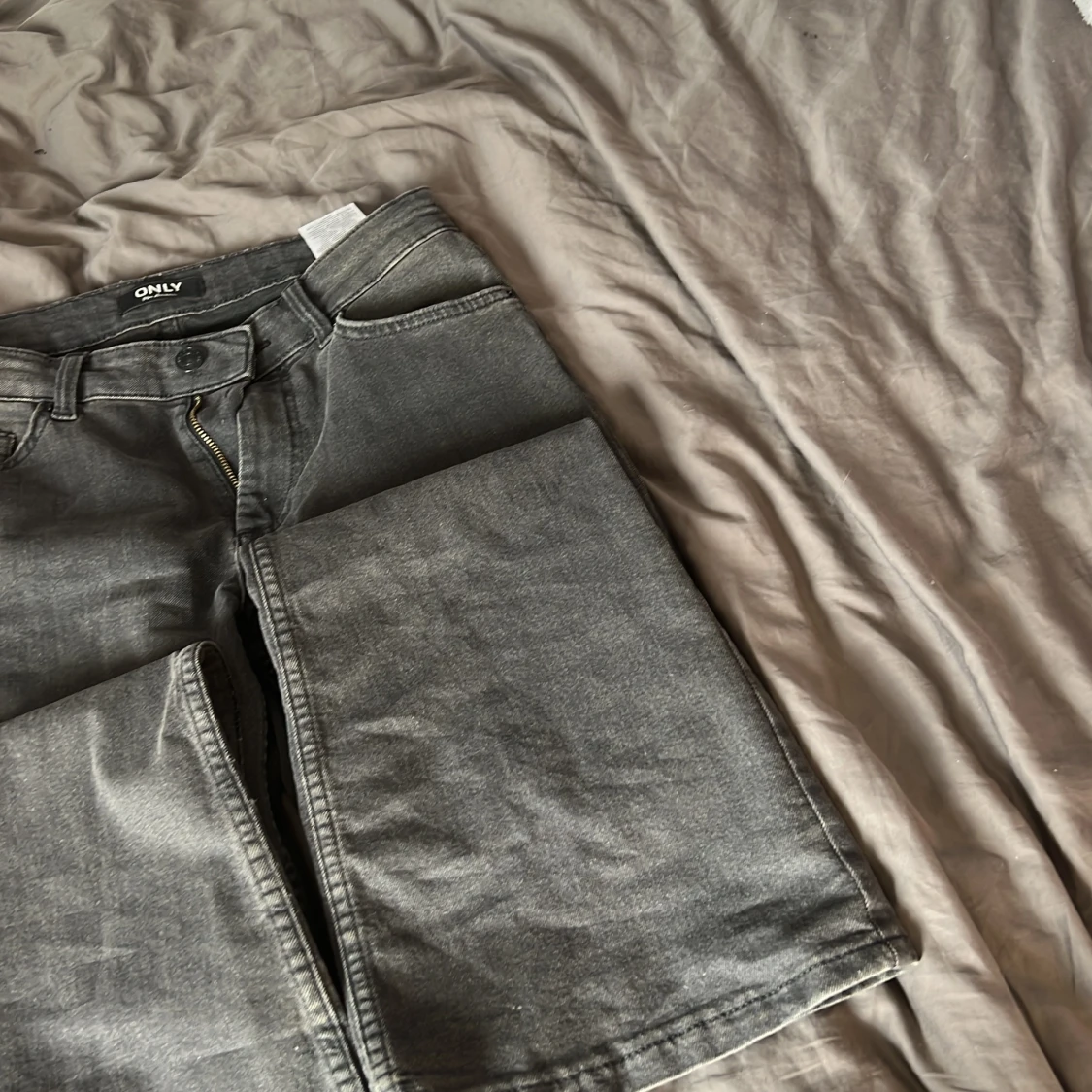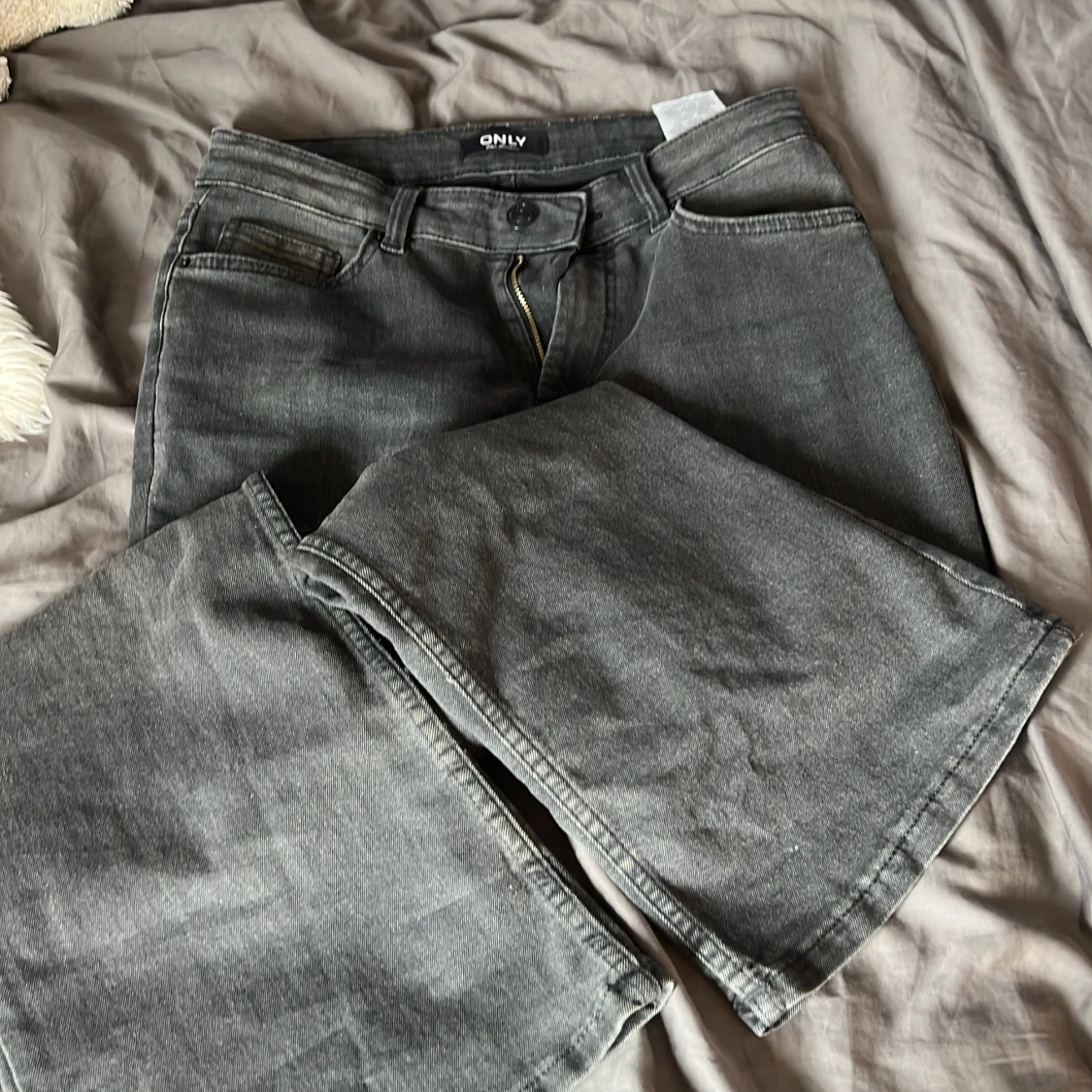 Snygga gråa jeans från ONLY med breda ben och klassisk femficksdesign. Jeansen har en normalhög midja, dragkedja och knapp framtill samt bälteshällor. Perfekta för dig som gillar en avslappnad och trendig stil.