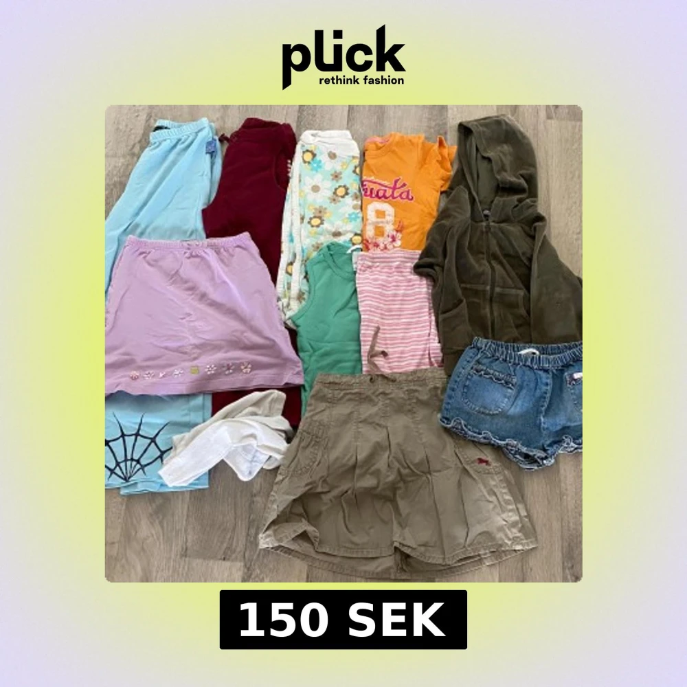 Superfint paket i stl 110/116! Helt och rent klädpaket men i använt skick. Innehåll: En lila kjol. Ett par jeansshorts. Ett par mjuka, sköna blå byxor med spiderman tryck. Mjuka, gosiga vinröda fleecebyxor. Trekvart byxor med blommor. Rosa/vitrandiga trekvart byxor. Vita strumpbyxor. Mörkgrön, gosig hoodie med dragkedja i materialet velour. Grönt linne. Orange T-shirt med tryck. Beige kjol.