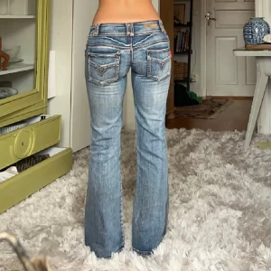 Jättefina lågmidjade jeans som har använts 2 gånger. De är i fint skick utan defekter. Midjemått 36cm och innerbenslängden är 77cm. (lånade bilder)