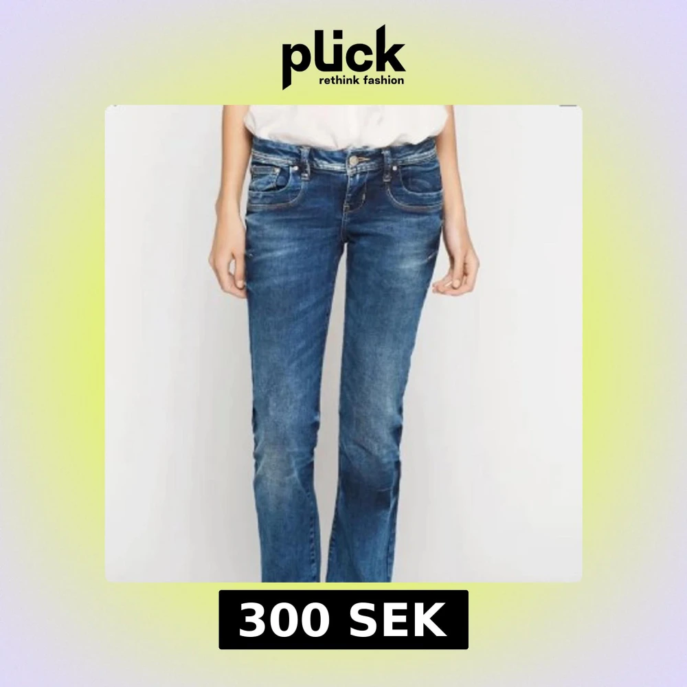 Snygga blå jeans med bootcut-stil och låg midja. De har klassiska fem fickor och en knappgylf. Perfekta för en avslappnad look. Från ltb nypris 900kr