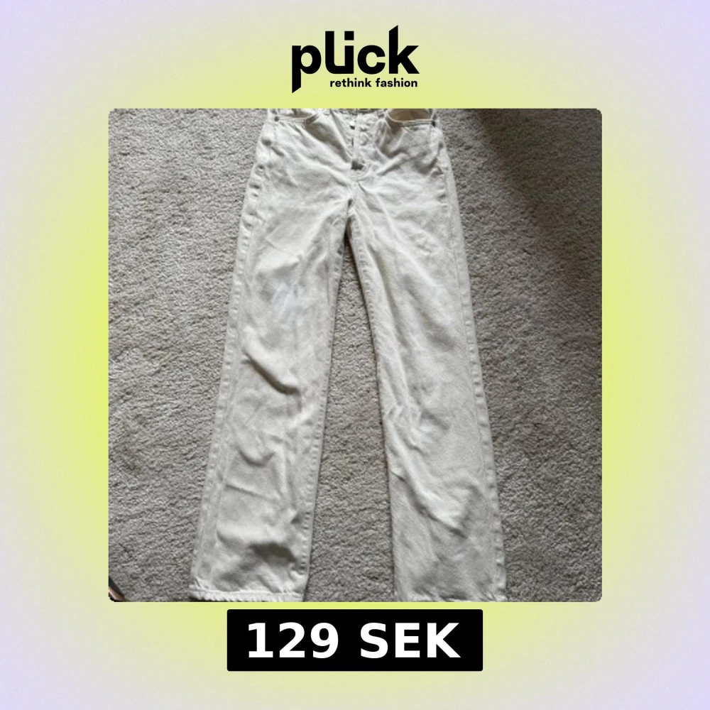 Säljer ett par snygga vita jeans från Never Denim i modellen Regular Wide. Byxorna har hög midja, raka och vida ben samt klassiska femficksdetaljer. Tillverkade i kraftigt jeanstyg som ger en clean och fräsch look.