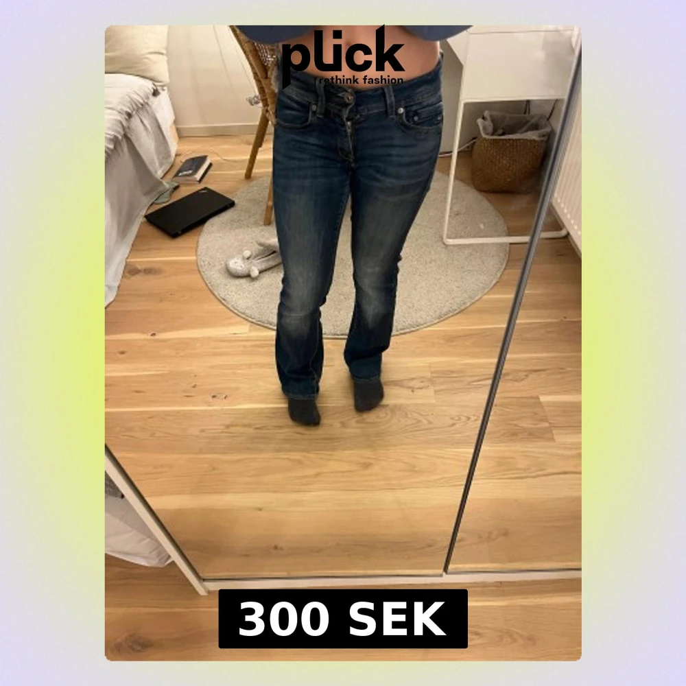 Snygga mörkblå bootcut lågmidjade jeans från G star. Lite slitna på insidan av låret vilket man kan se på bild 4 men det är inget man märker när man har på sig dem!