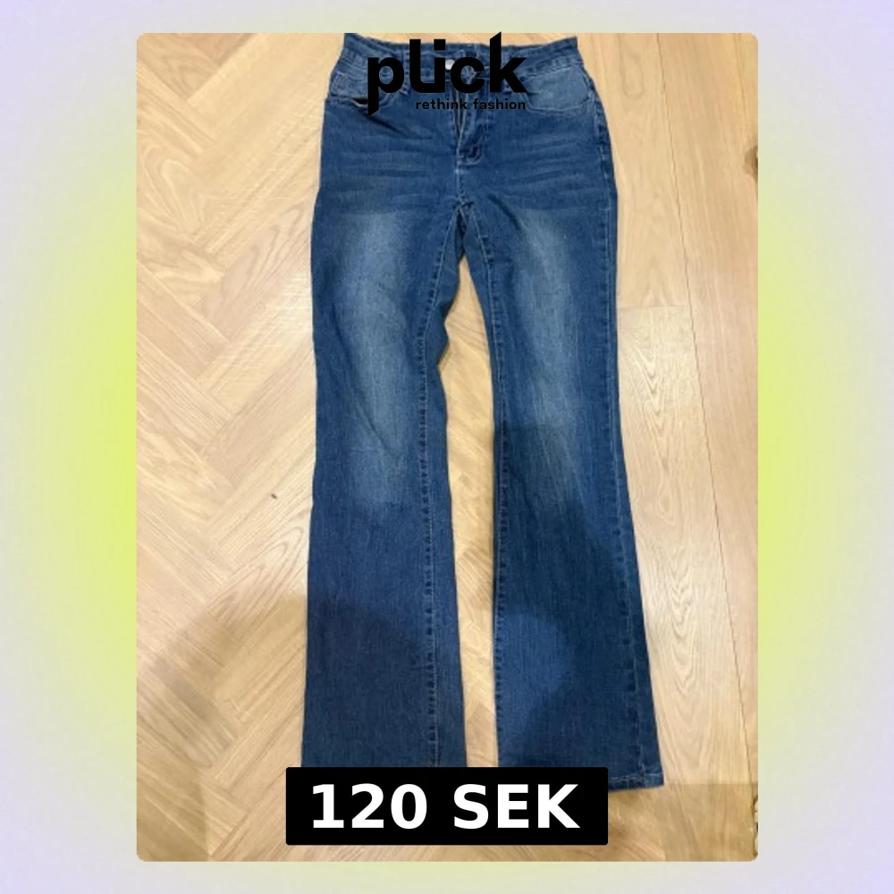Snygga blå jeans från SHEIN i bootcut-modell med klassisk femficksdesign och hög midja. Jeansen har en lätt tvättad look och är tillverkade i stretchigt bomullsmaterial för skön passform. Perfekta för dig som gillar retrovibbar och vill ha ett par jeans med lite vidare ben.