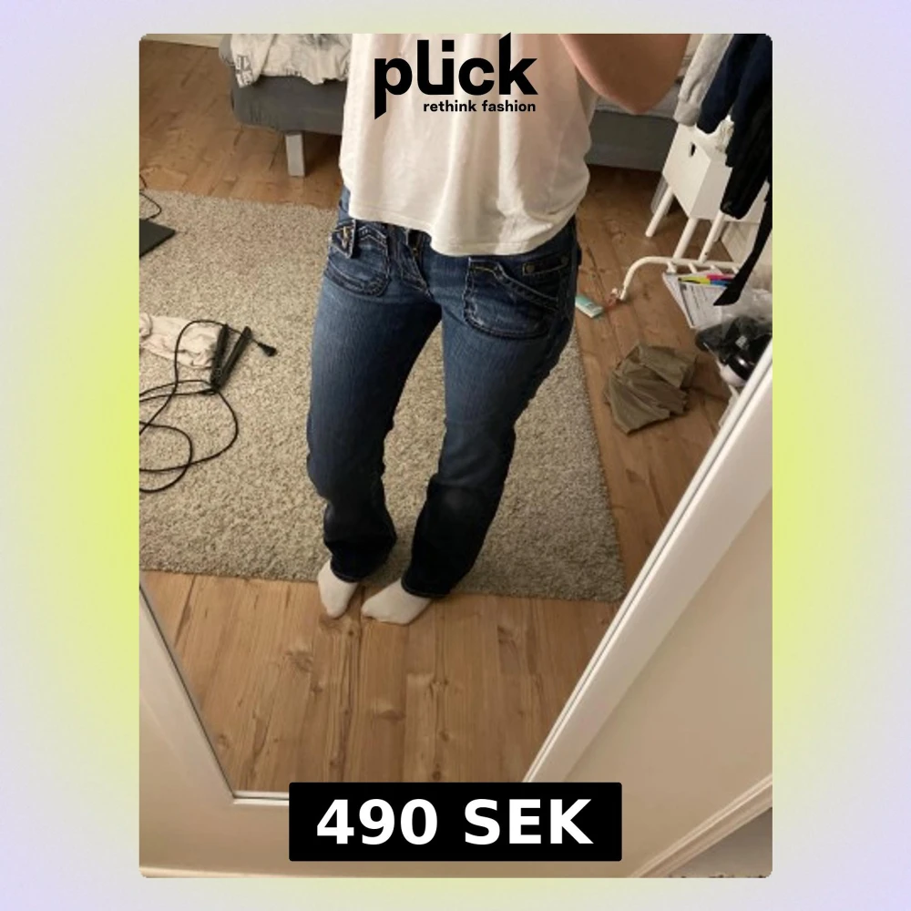 Säljer ett par mörkblå jeans från K-Star med snygga kontrastsömmar och coola fickdetaljer. Modellen har bootcut-ben och låg midja, klassisk femficksdesign och ett svart läderpatch bak.