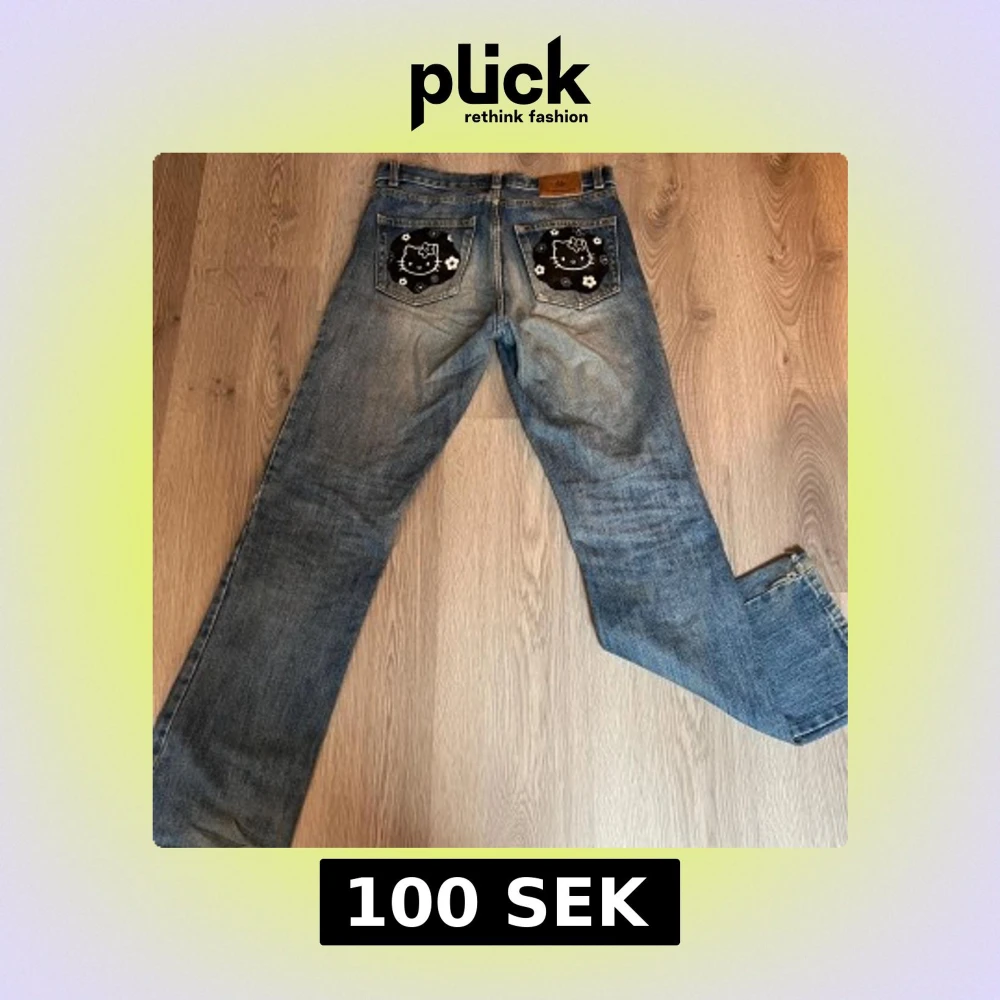 Unika blå jeans med jätte söta hello Kitty detaljer, storlek 27-32.💓 Säljer för att dom tyvärr är för små för mig💕.