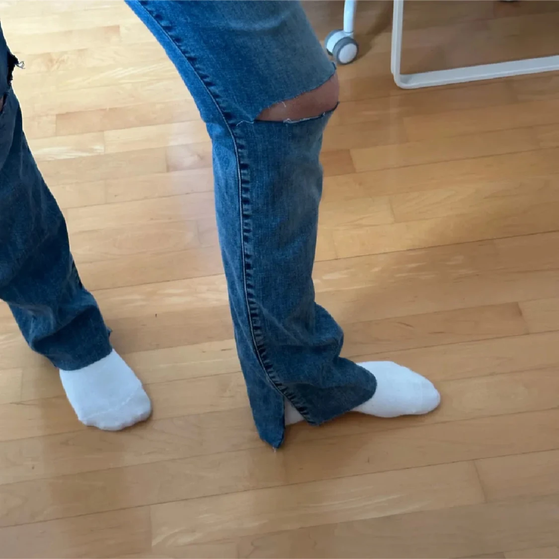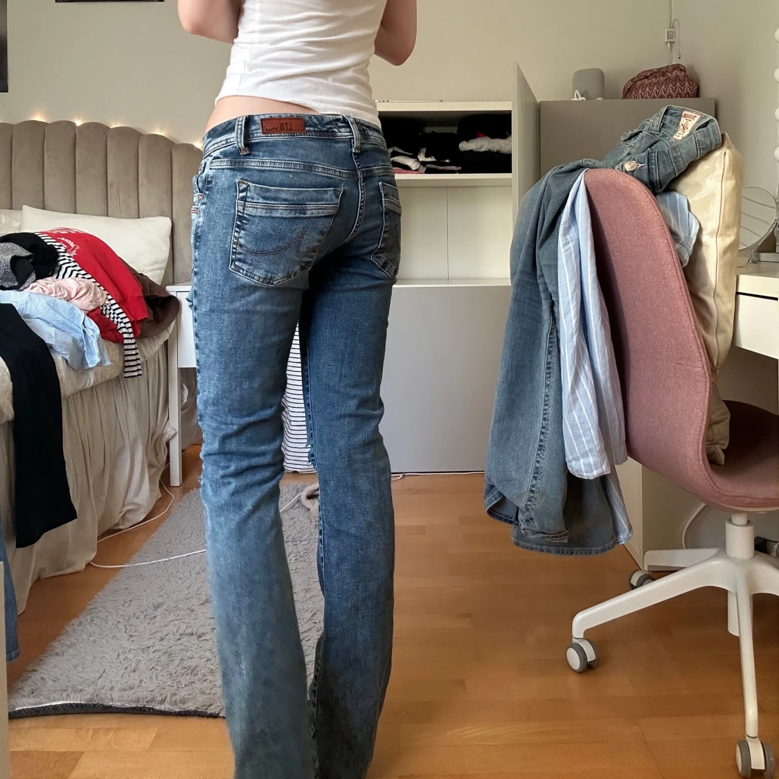 Säljer ett par blå jeans från G-Star Raw med raka ben och snygga slitningar över knäna. Jeansen har klassisk femficksdesign, låg midja och är tillverkade i jeansmaterial. Perfekta för en avslappnad och trendig look. Midjemått- 34 cm tvärs över, innerben- 81. Gjort om de själv