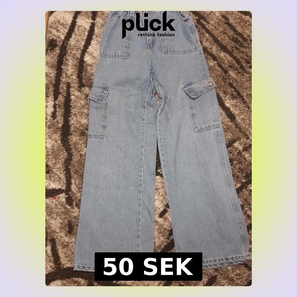 Säljer ett par ljusblå cargopants i jeansmaterial med breda ben och stora fickor på sidorna. Byxorna har normal passform och klassisk midja, samt knappstängning på fickorna. Perfekt för dig som gillar streetwear och praktiska detaljer. Jättefina baggy cargopants men ör för små