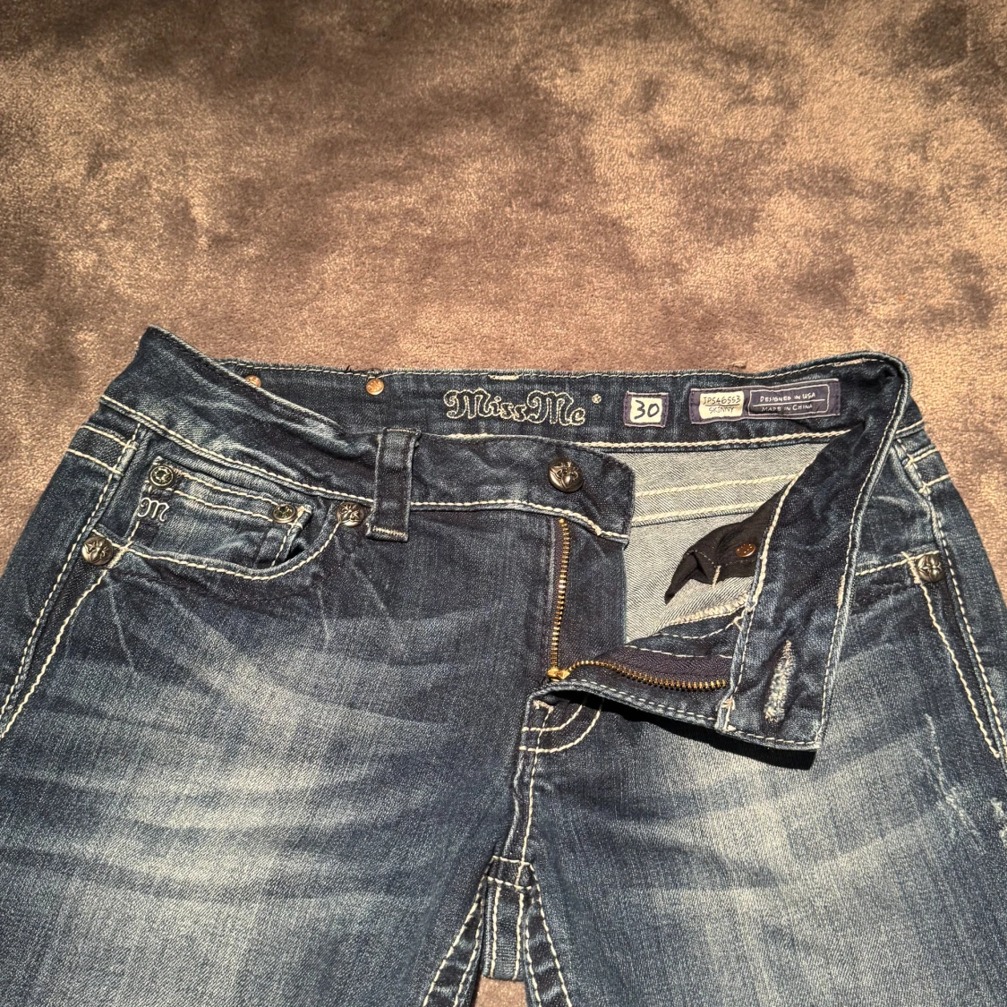 Snygga blå jeans från Miss Me med snygga broderade detaljer på bakfickorna🥰. Dem är lågmidjade, skinny/raka och i storlek 30(M/L)💕Svarar gärna på frågor ❤️