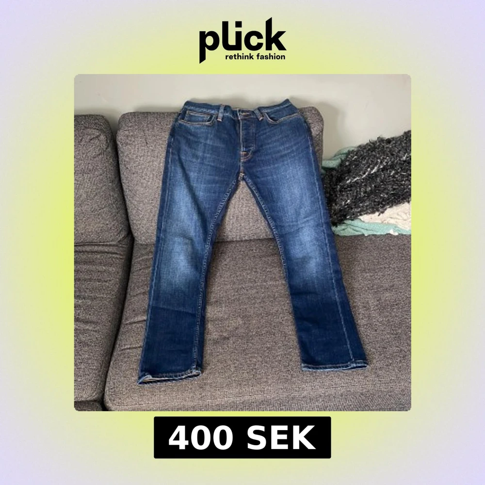 Säljer ett par klassiska mörkblå jeans från Nudie Jeans med snygga kontrastsömmar och ikoniska broderade bakfickor. Jeansen har rak passform och normal midja, tillverkade i slitstarkt bomullstyg. Perfekta för en avslappnad och stilren look.
