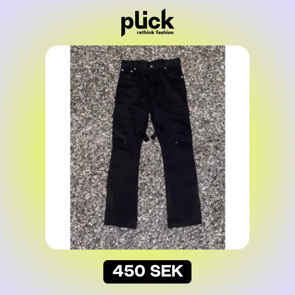 Vuja De cargobyxor i storlek S/(30/31) typ. Extremt bra passform, de lägger sig över skorna men ser inte ut att vara för stora.
