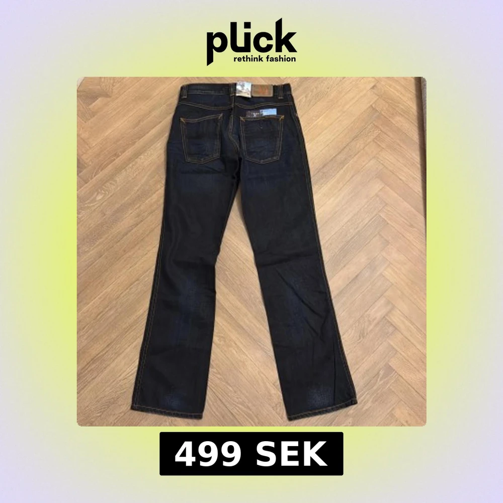 Säljer ett par mörkblå jeansbyxor från Nudie Jeans med raka ben och klassiska orangea sömmar. Byxorna har fem fickor och läderpatch med logga bak i midjan. Perfekta för dig som gillar stilrena och tidlösa jeans.