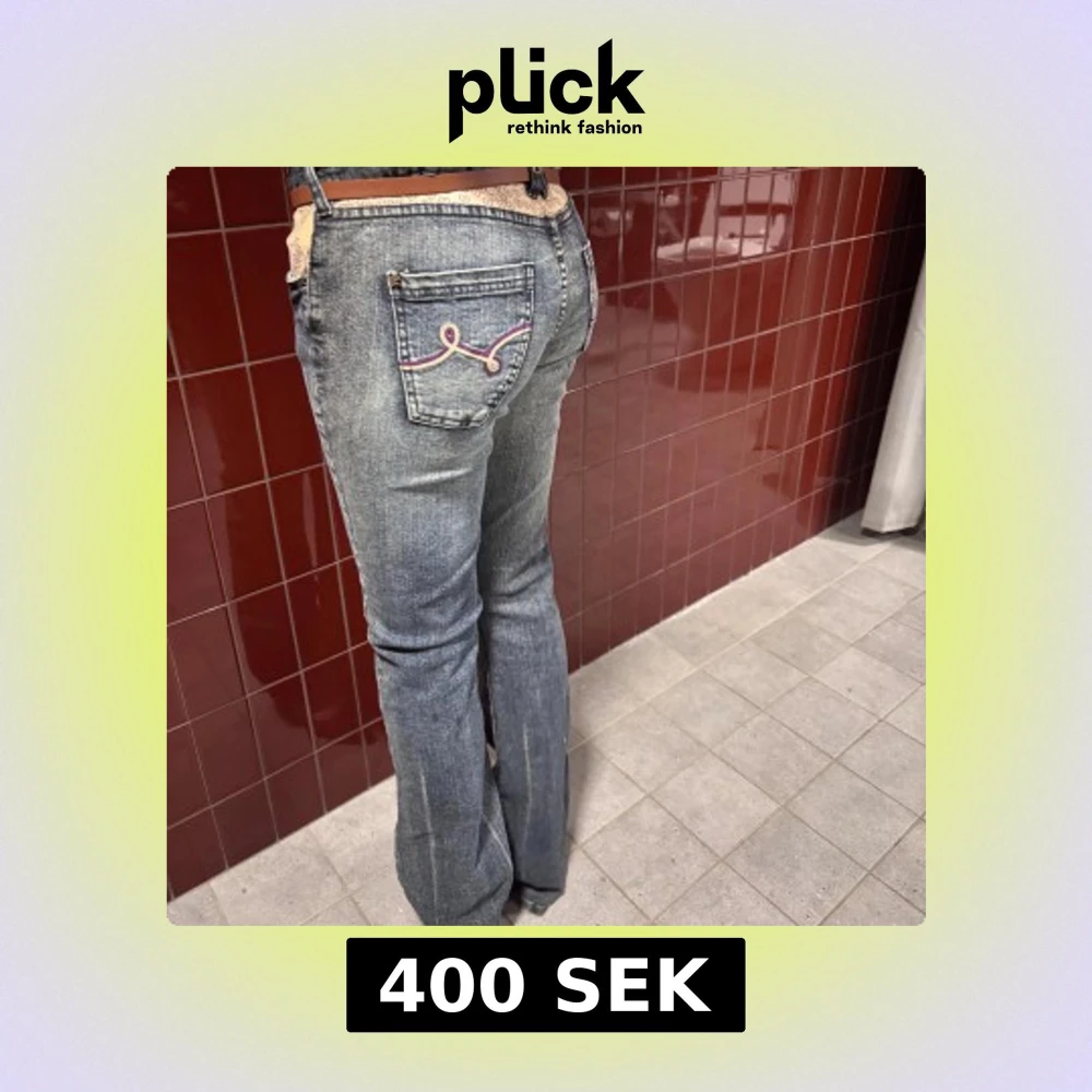 Snygga blå bootcut jeans med unika broderade detaljer på bakfickorna. Lågmidjade jeans🤩 modellen är 164 för preferens.