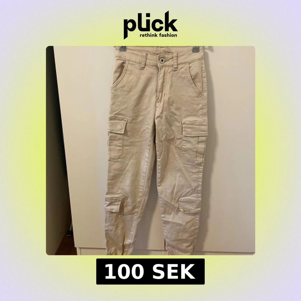 Säljer ett par beige cargopants med flera praktiska fickor på benen och bak. Byxorna har elastiska benslut och klassisk midja.