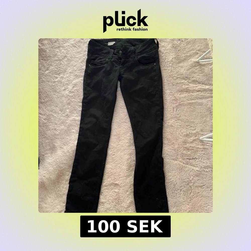 Snygga svarta jeans från Pepe Jeans med regular fit och låg midja. De är straight och är från sellpy men inte passat💕I längden är dom 32 men dom är lite större i midjan