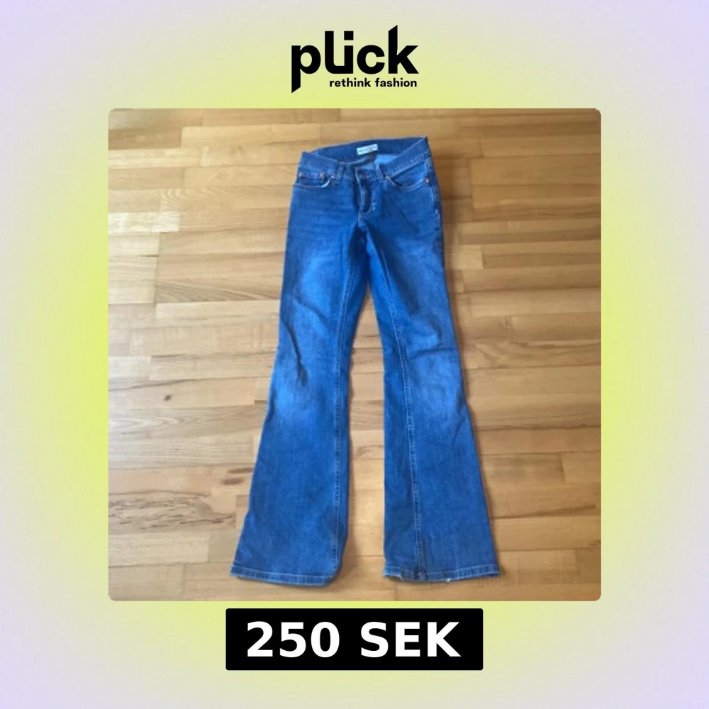 Säljer ett par klassiska blå bootcut jeans från Gina tricot. De har en snygg passform med låg midja och är perfekta för en avslappnad stil. Jeansen har en knapp och dragkedja framtill samt fickor både fram och bak.