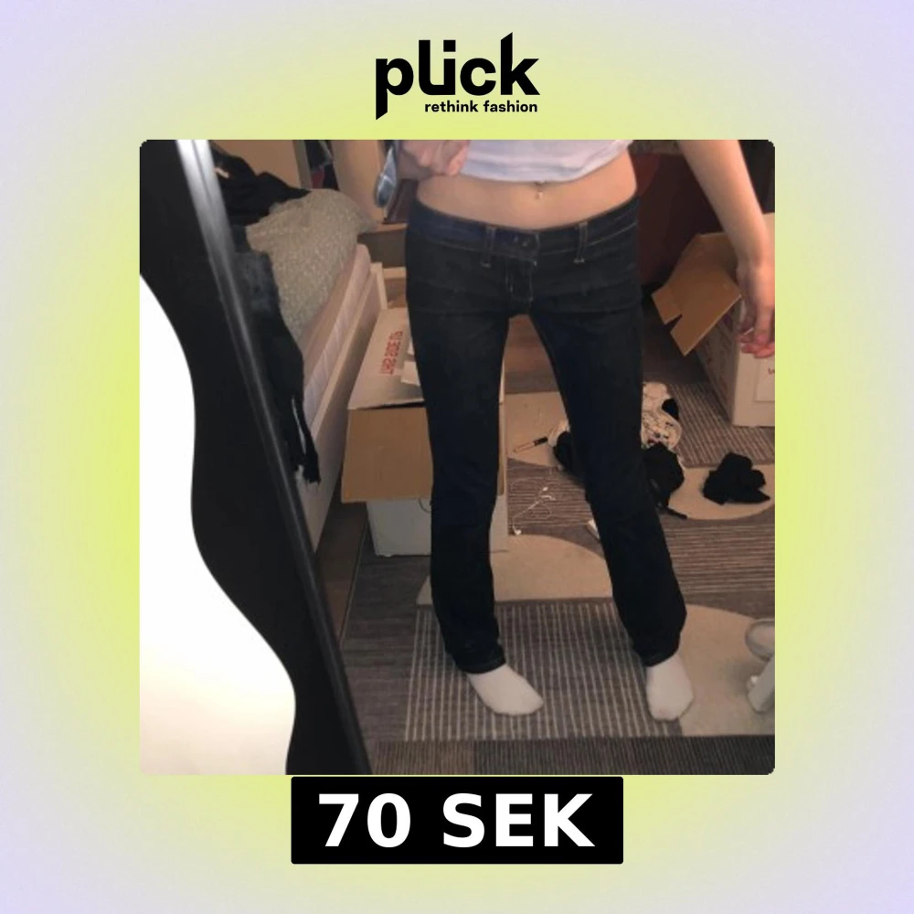 Säljer ett par mörkblå jeans med låg midja och raka ben. Jeansen har klassiska kontrastsömmar och femficksmodell. Snygg passform som sitter tajt över höfterna och låren, och är lite rakare nertill. Perfekta till sneakers eller boots.