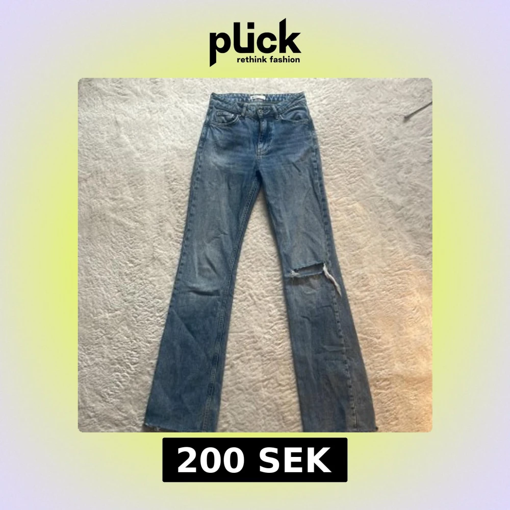 Ljusblå bootcut jeans med slitningar - Säljer ett par ljusblå bootcut lowwaisted jeans! Köpta här på plick med passade inte tyvärr.💕midjemåttet är 31, innerbenslängden 80! (Inte mina bilder). Två små hål i rumpan men inget som syns när jeansen sitter på.(se sista bild)