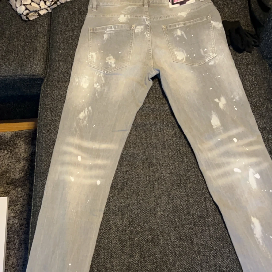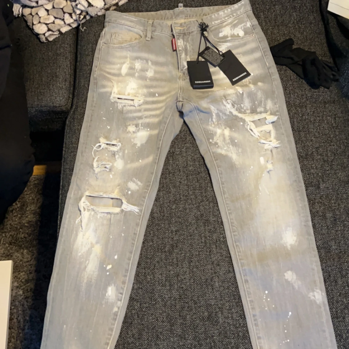 Snygga grå jeans från Dsquared2 med coola slitningar och färgstänk. De har en modern design med en normal passform och midwaist. Perfekta för en trendig look. Aldrig använda storlek 32