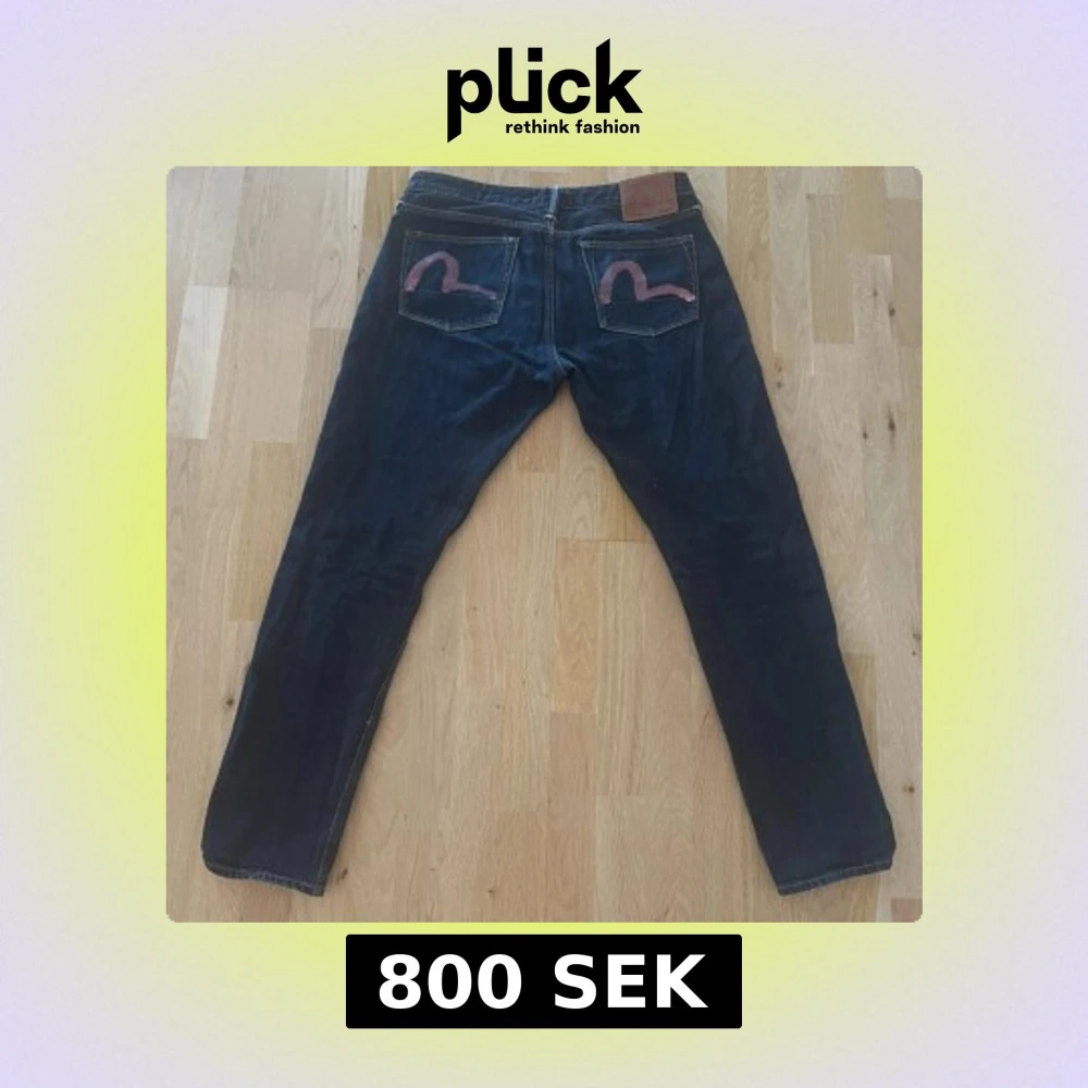 Mörkblå jeans från Evisu, modell 2017. Klassisk femficksdesign med raka ben och snygga rosa broderade detaljer på bakfickorna. Jeansen har läderpatch i midjan och kontrastsömmar. Perfekt för dig som gillar japansk denim och unika detaljer. Skriv för mer information🙌