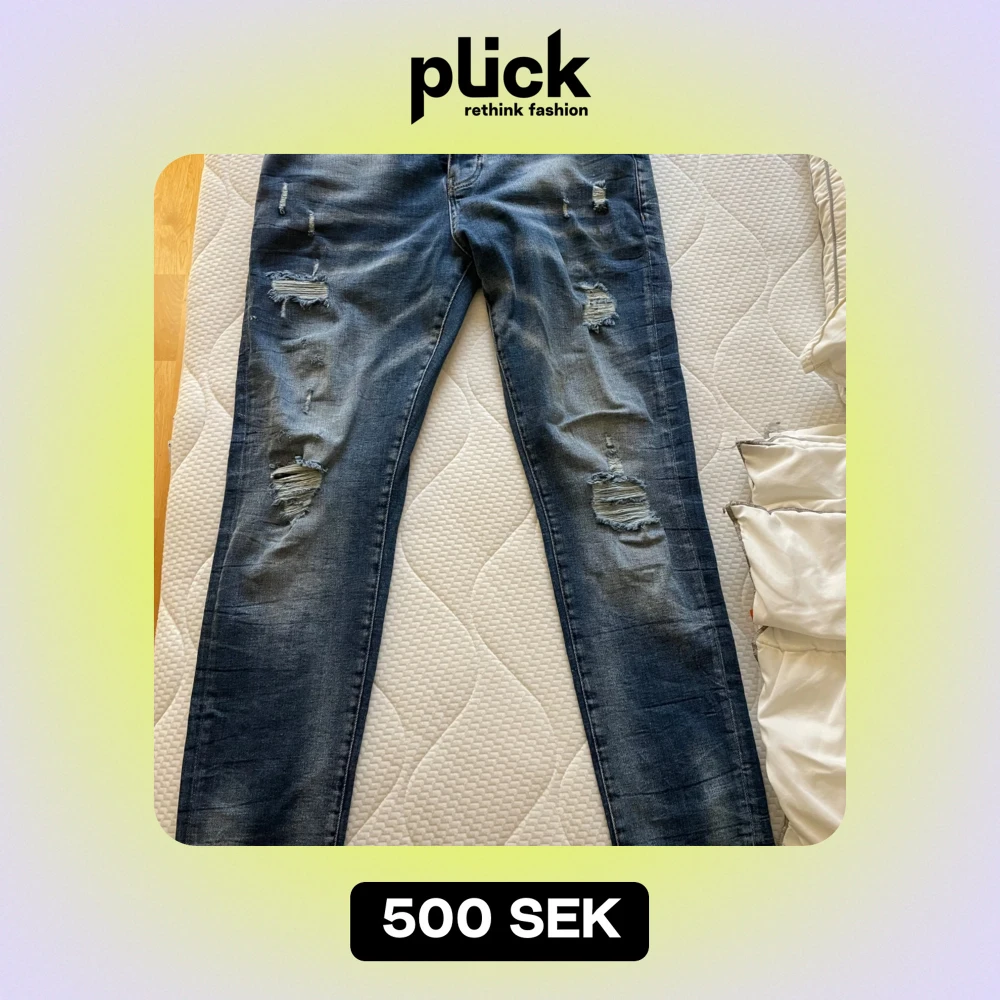 Säljer ett par snygga blå jeans endast provade från Dsquared2 i storlek 33. De har en cool slitningseffekt och en klassisk femficksdesign. Perfekta för en avslappnad stil med en touch av edge. Passar både till vardags och fest!